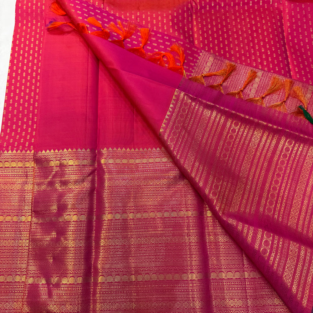 Steeped in tradition and crafted with devotion, the Kanchipuram silk saree is more than just attire — it’s a legacy. Woven in the historic temple town of Kanchipuram in Tamil Nadu, these sarees are renowned for their rich silk, bold colors, and intricate zari work that tell stories of heritage, devotion, and divine artistry.