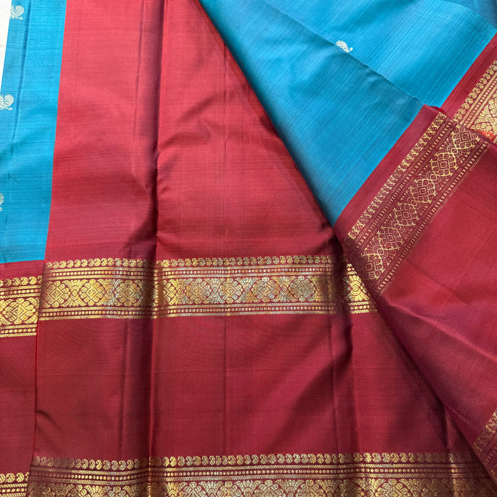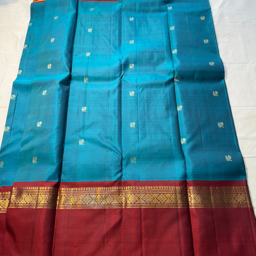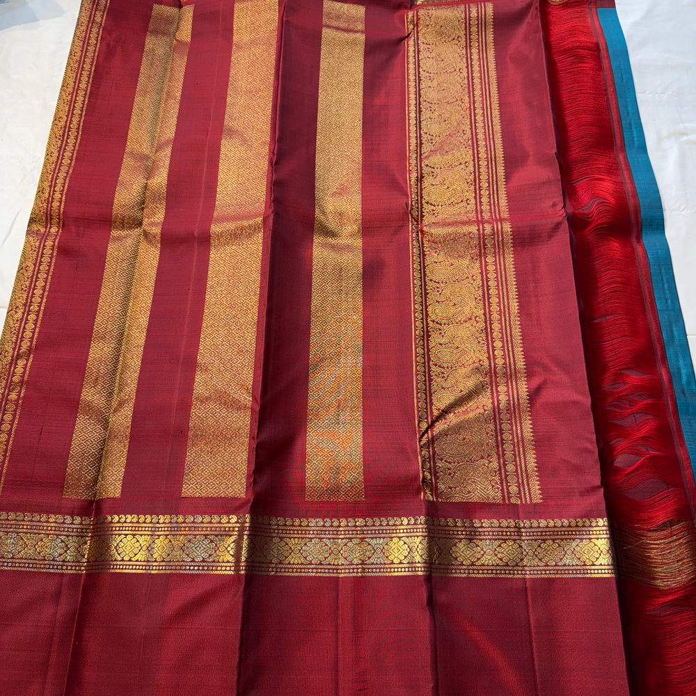 Regular price Rs. 14,999.00Saree Fabric: Korvai Kanchipuram silk sarees are renowned for their exquisite craftsmanship, featuring contrasting borders that enhance their elegance. The 'small border' variant typically showcases borders less than 15 cm in width, offering a refined and understated aesthetic. These sarees are versatile, suitable for both formal and semi-formal occasions.