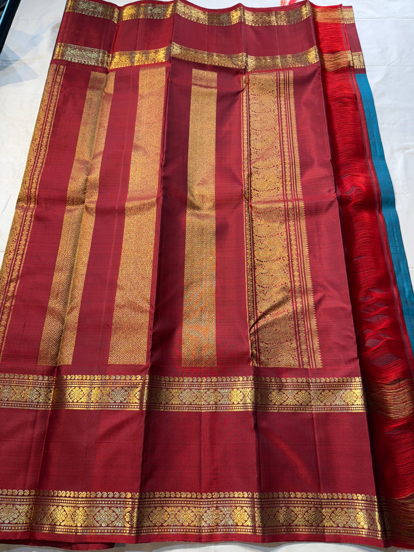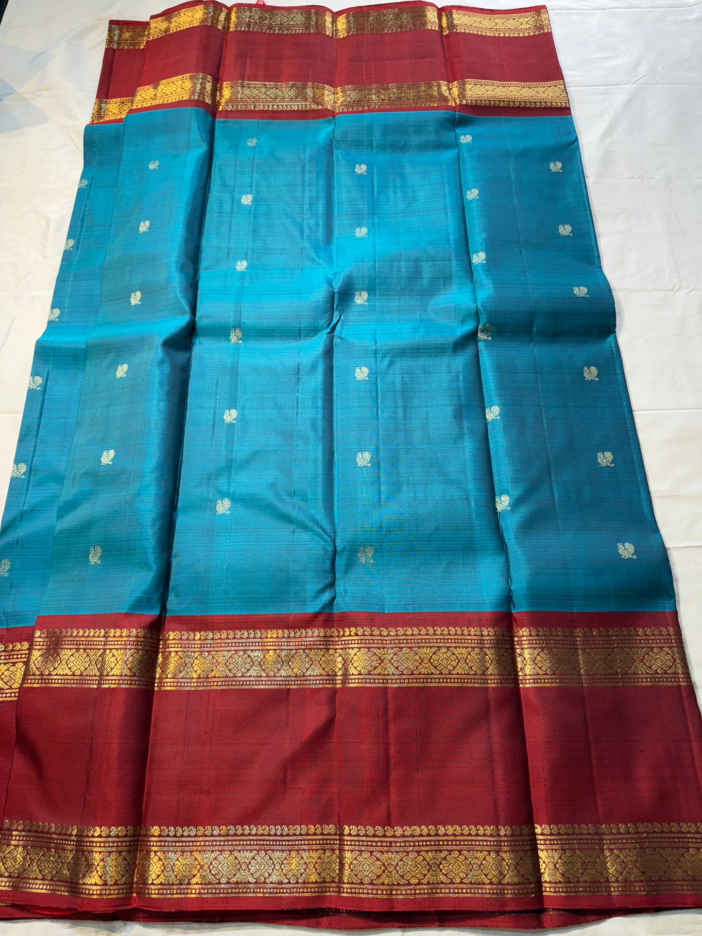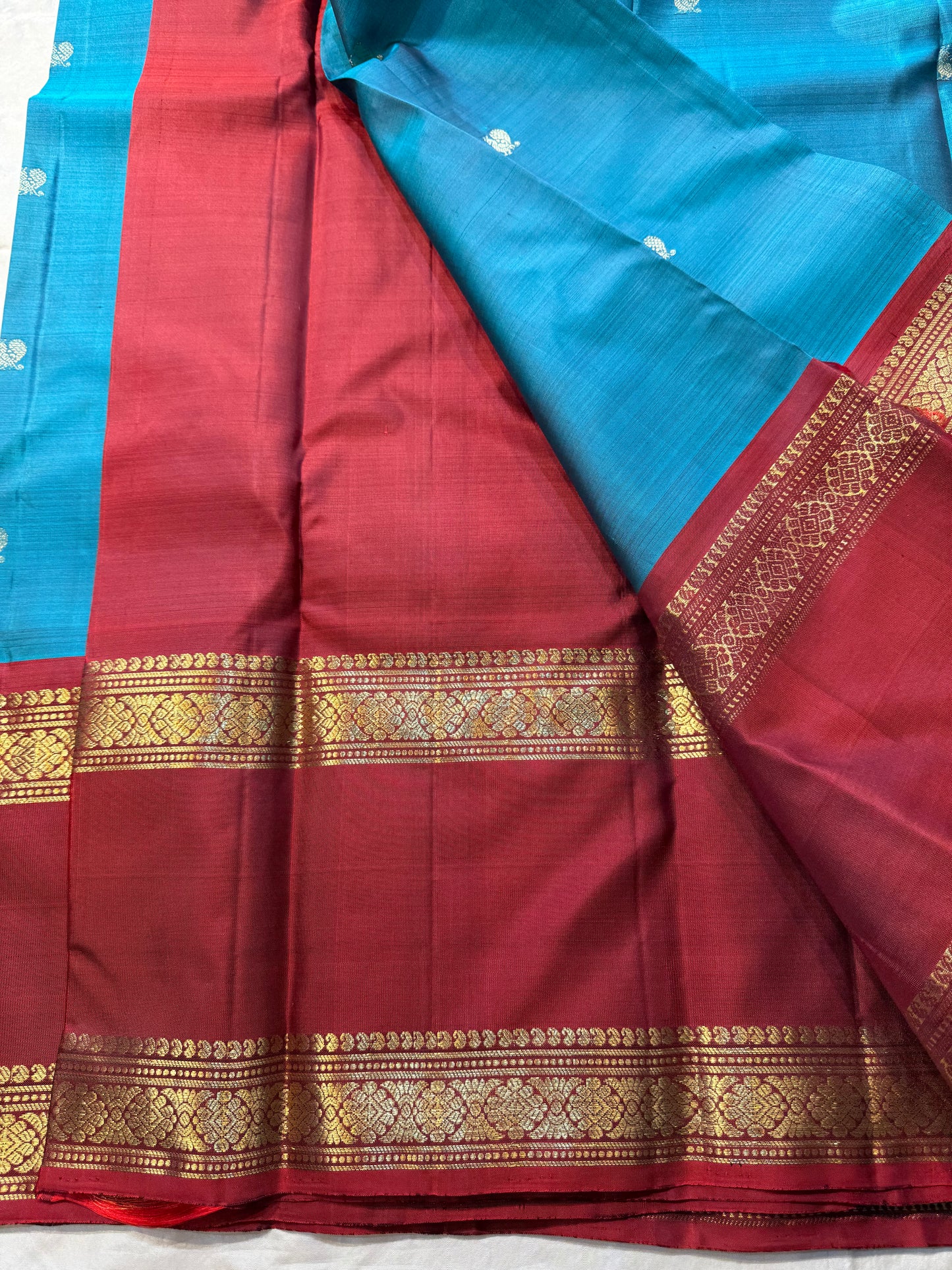 Regular price Rs. 14,999.00Saree Fabric: Korvai Kanchipuram silk sarees are renowned for their exquisite craftsmanship, featuring contrasting borders that enhance their elegance. The 'small border' variant typically showcases borders less than 15 cm in width, offering a refined and understated aesthetic. These sarees are versatile, suitable for both formal and semi-formal occasions.