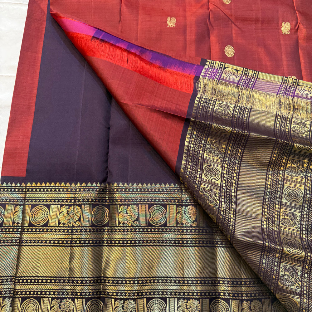 Regular price Rs. 15,800.00Saree Fabric: Korvai Kanchipuram silk sarees are renowned for their exquisite craftsmanship, featuring contrasting borders that enhance their elegance. The 'small border' variant typically showcases borders less than 15 cm in width, offering a refined and understated aesthetic. These sarees are versatile, suitable for both formal and semi-formal occasions.