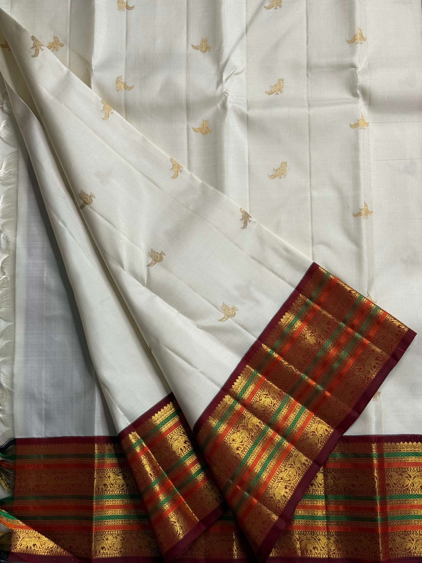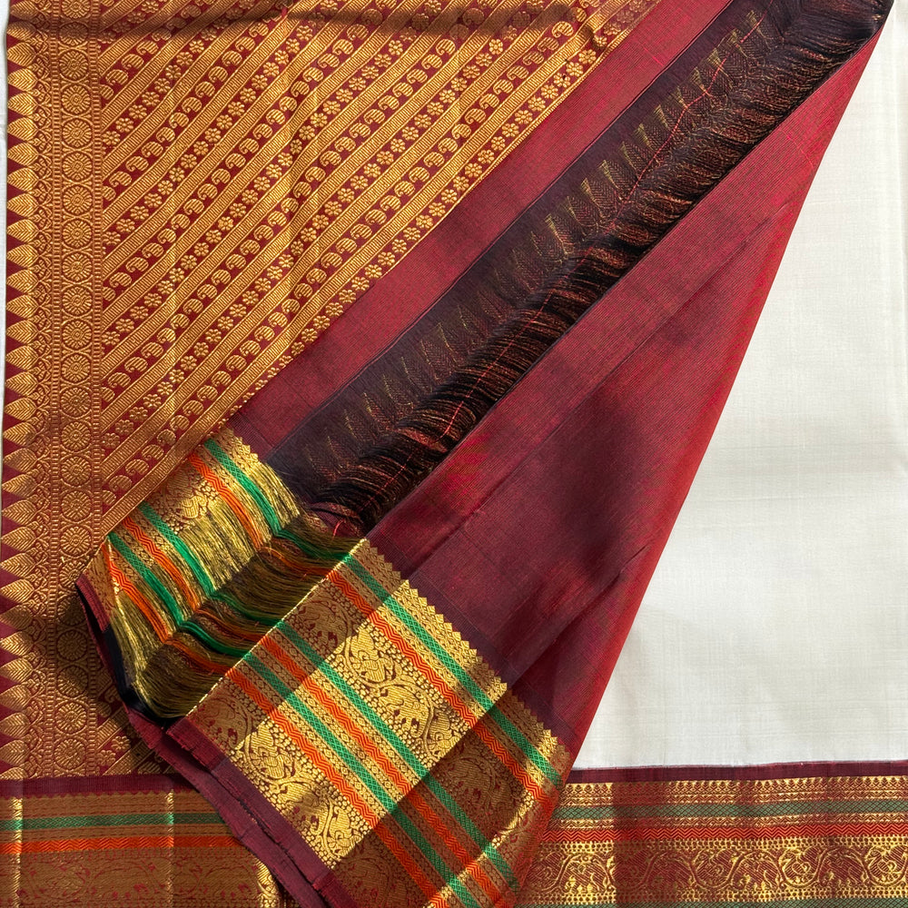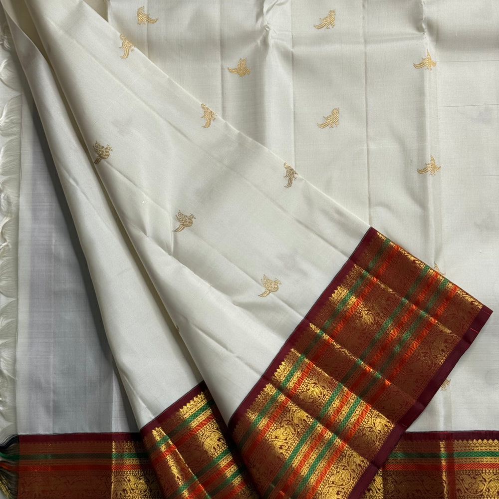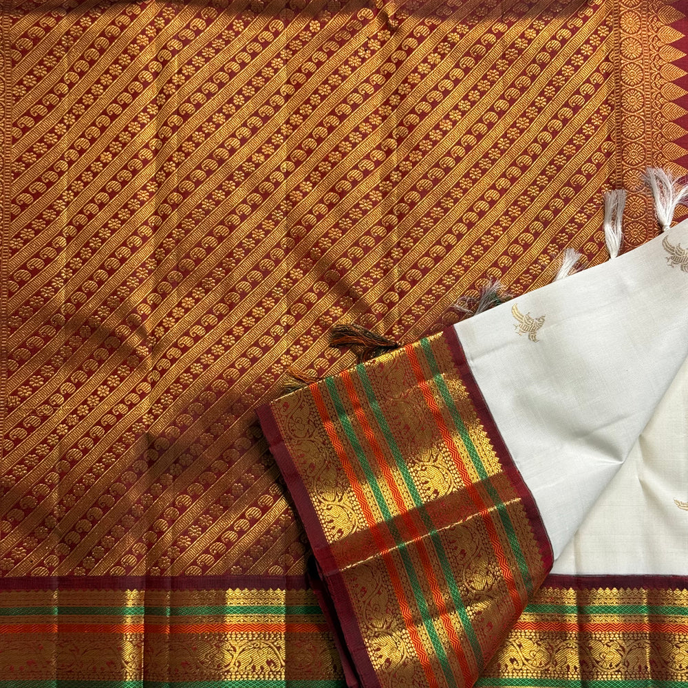 That’s the magic of Korvai — the art of interlocking contrast borders into the body of a Kanchi silk saree. No shortcuts. Just centuries of skill woven into every inch.