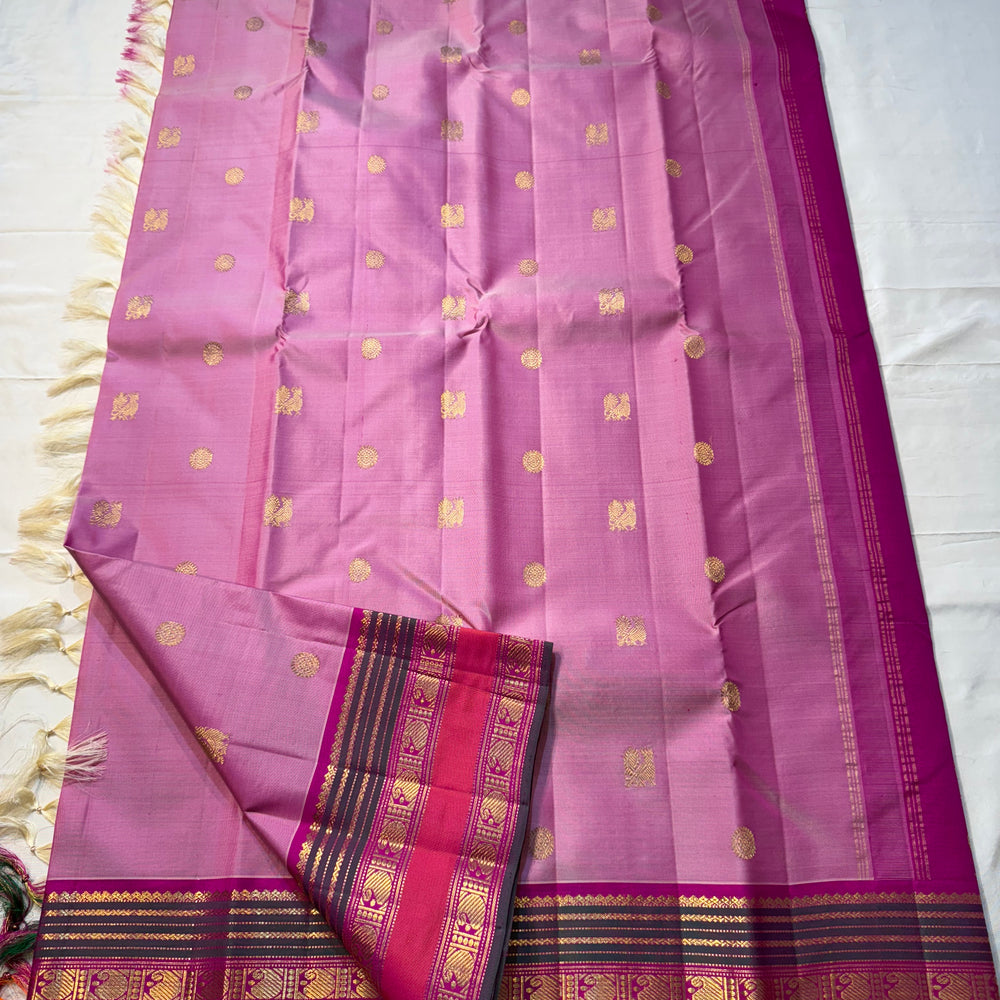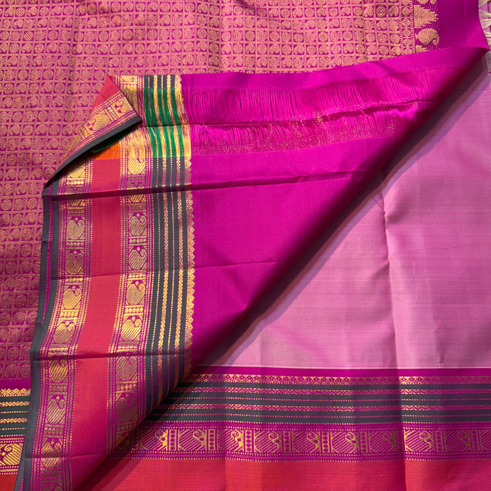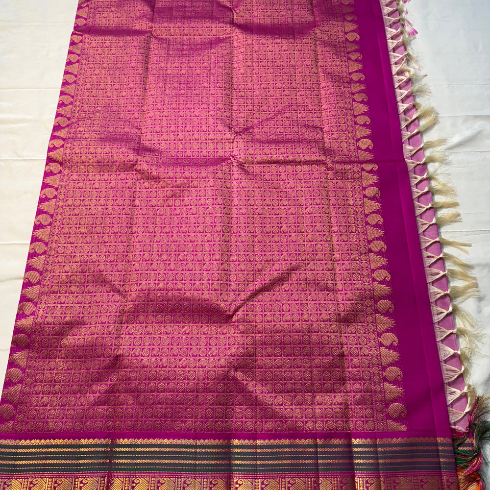 That’s the magic of Korvai — the art of interlocking contrast borders into the body of a Kanchi silk saree. No shortcuts. Just centuries of skill woven into every inch.