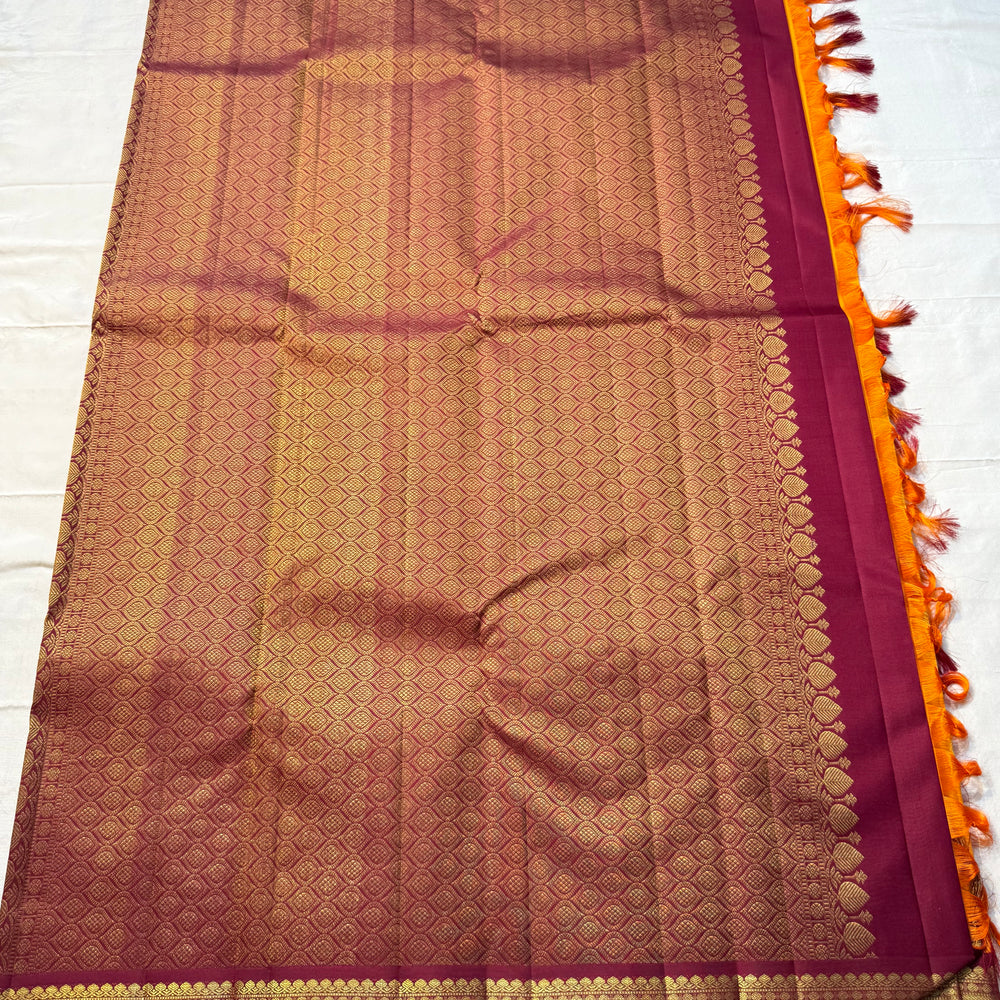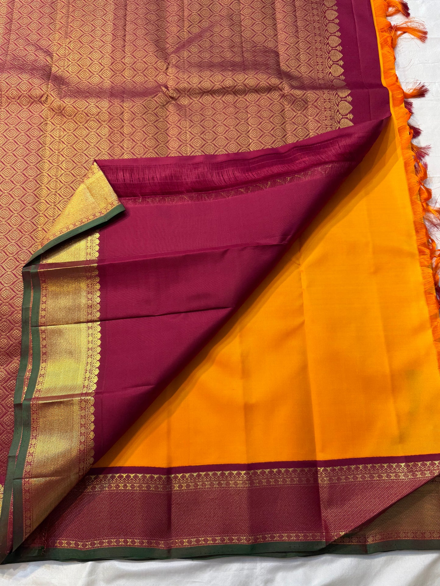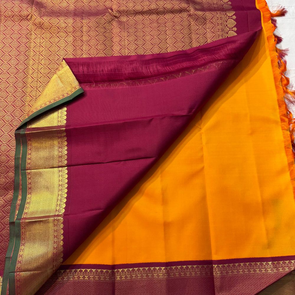 That’s the magic of Korvai — the art of interlocking contrast borders into the body of a Kanchi silk saree. No shortcuts. Just centuries of skill woven into every inch.