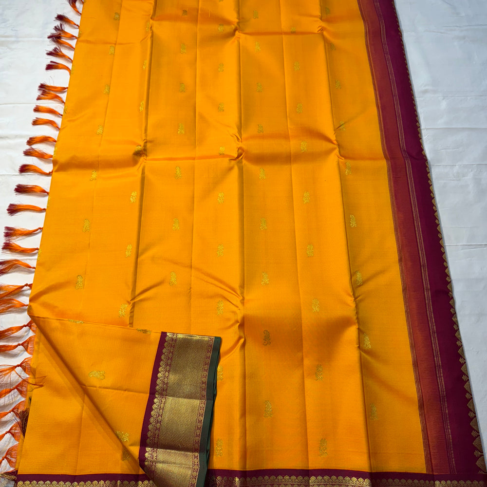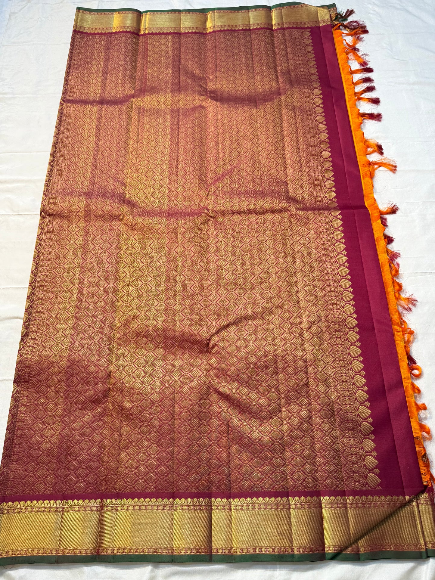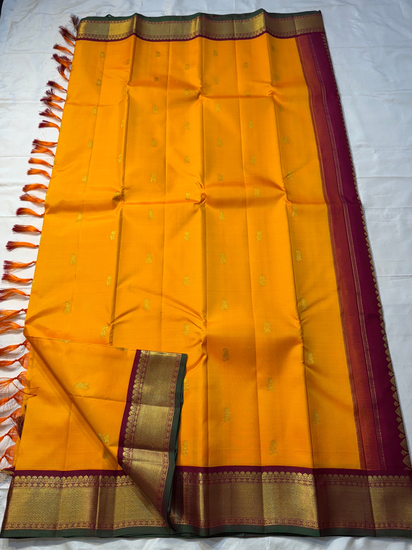 That’s the magic of Korvai — the art of interlocking contrast borders into the body of a Kanchi silk saree. No shortcuts. Just centuries of skill woven into every inch.