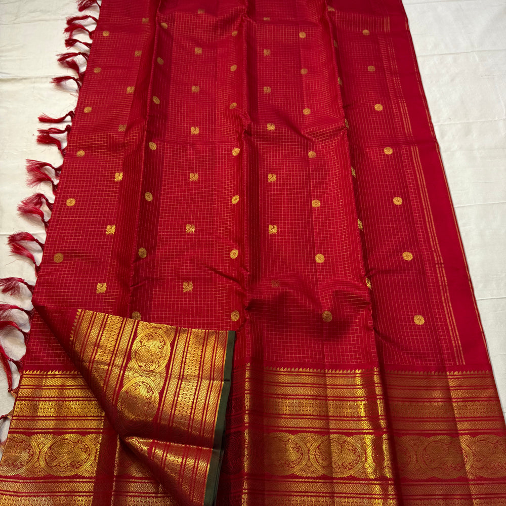 Steeped in tradition and crafted with devotion, the Kanchipuram silk saree is more than just attire — it’s a legacy. Woven in the historic temple town of Kanchipuram in Tamil Nadu, these sarees are renowned for their rich silk, bold colors, and intricate zari work that tell stories of heritage, devotion, and divine artistry.