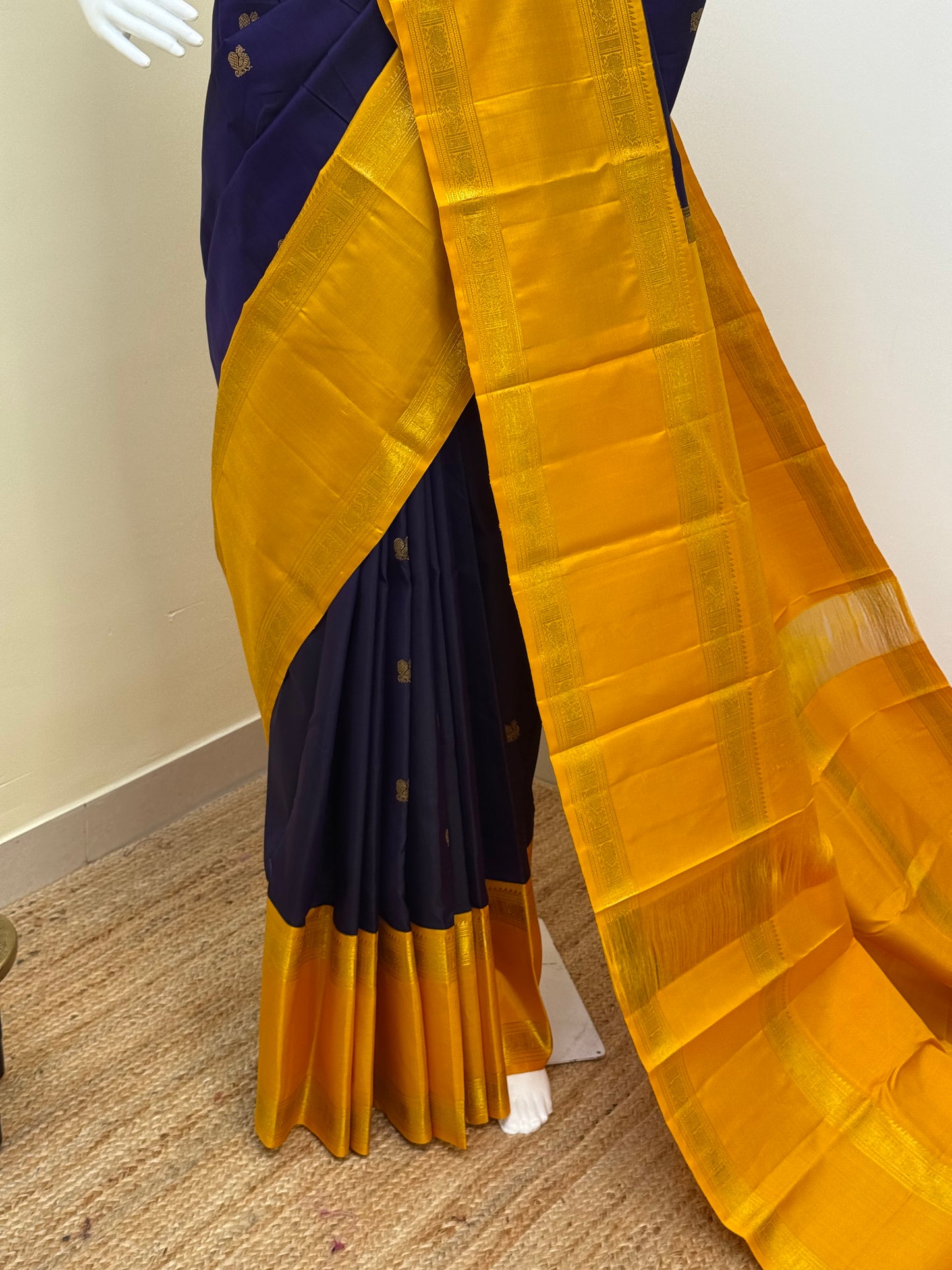 GEETHA 04( Dark Violet Korvai Kanchipuram Silk Saree with contrast Yellow On Gap border)