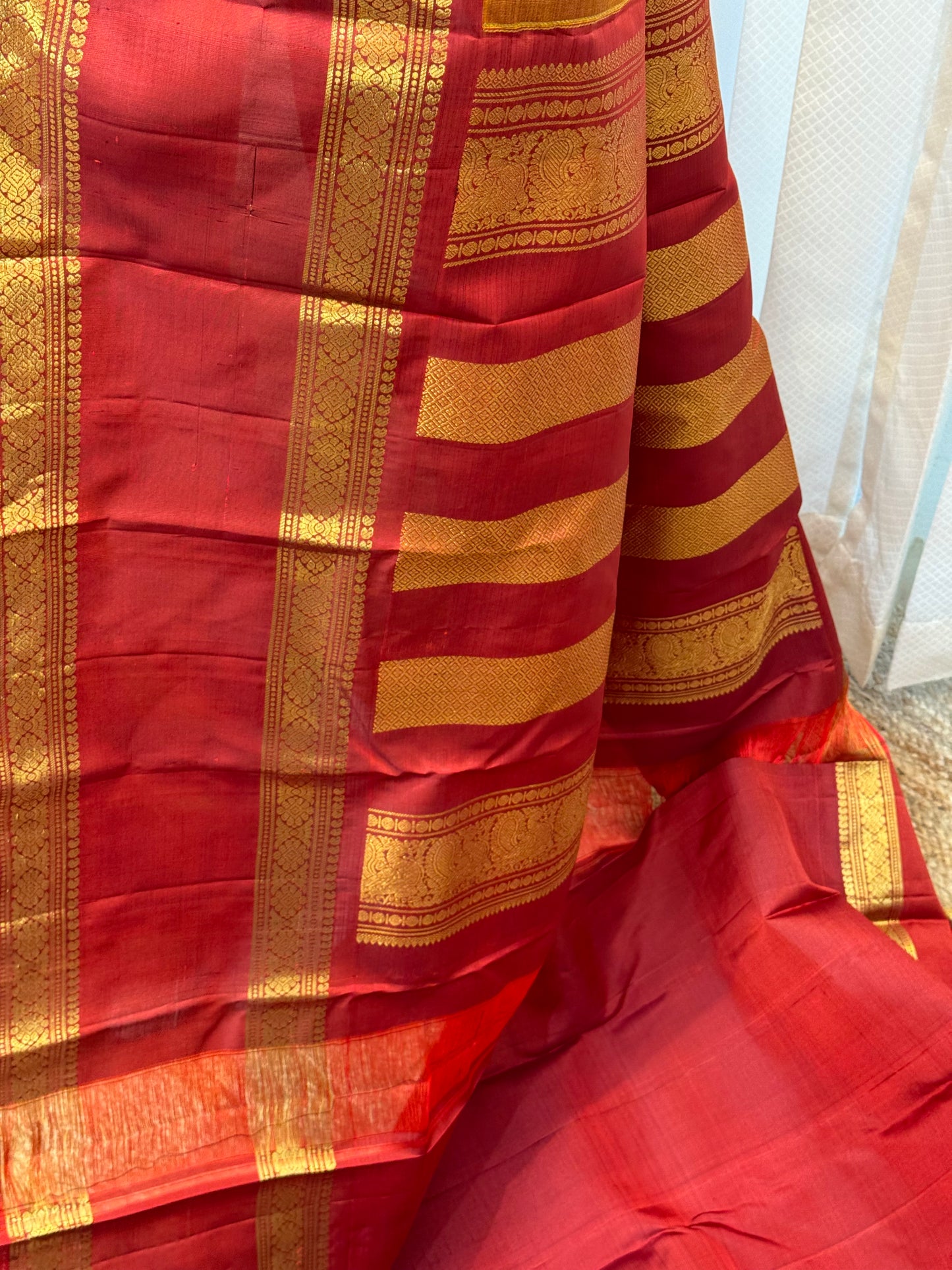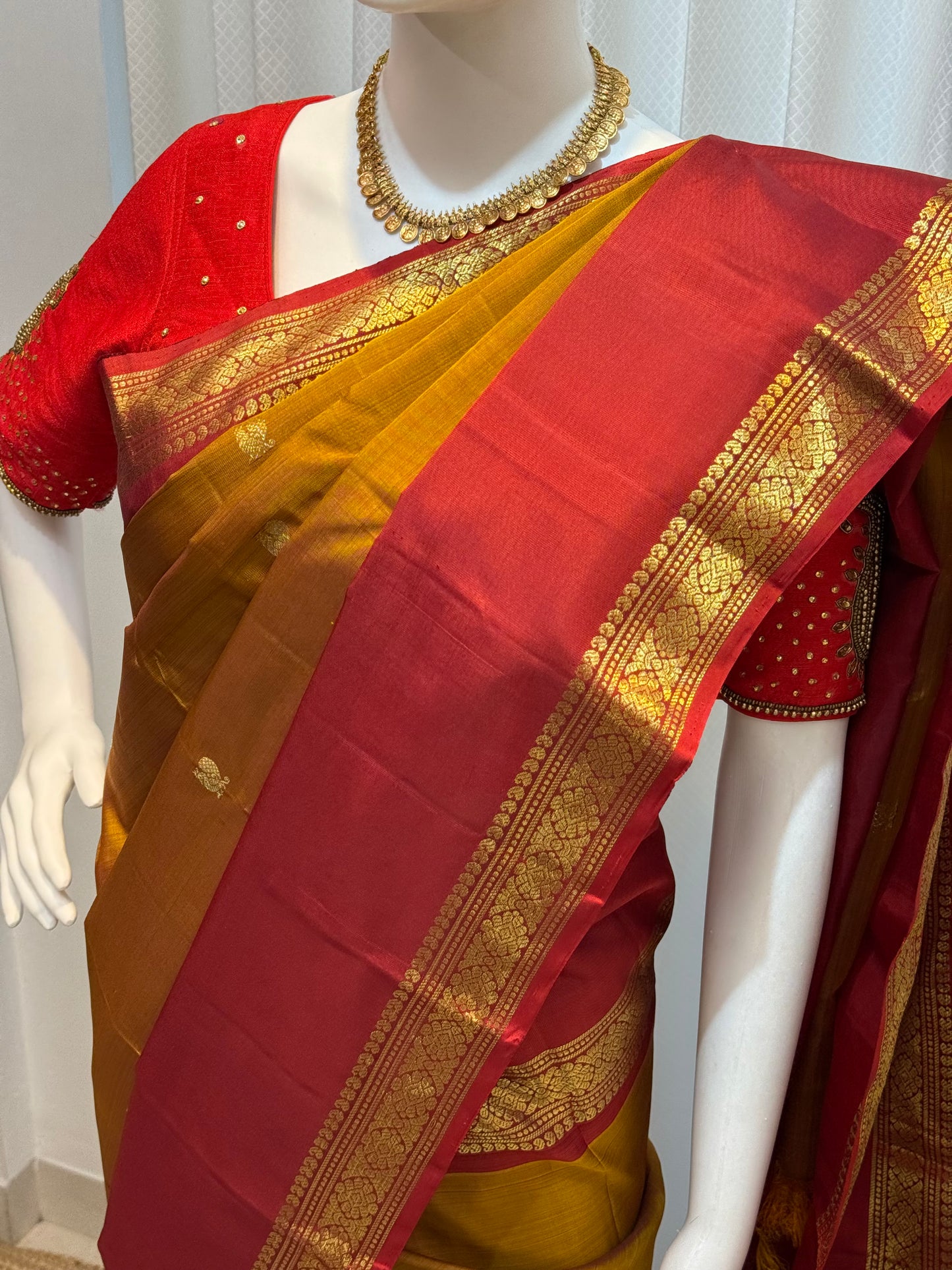 GEETHA 04( Mustard Yellow Korvai Kanchipuram Silk Saree with contrast Marron On Gap border)