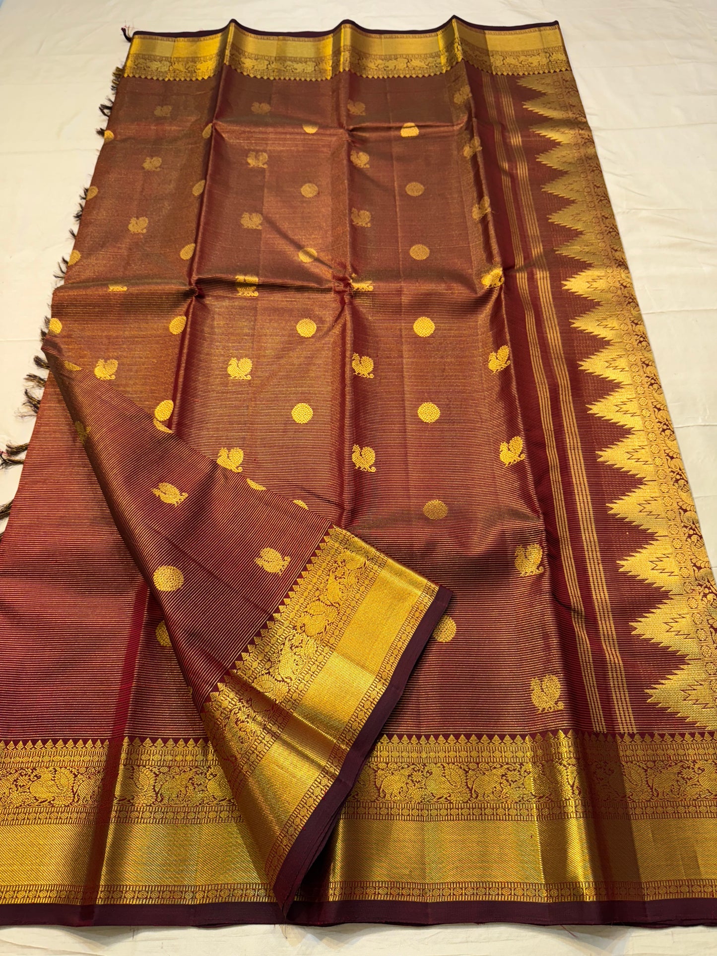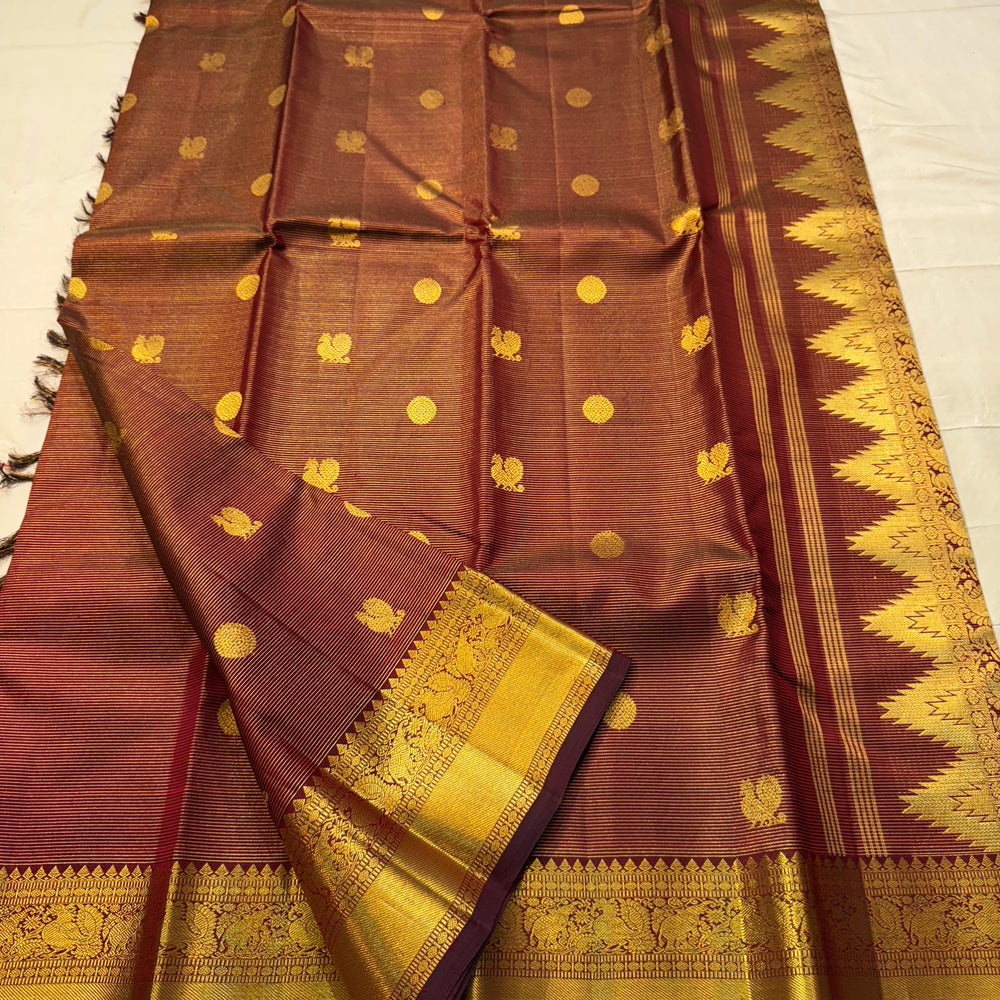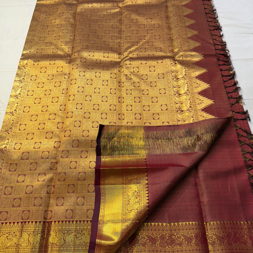 Regular price Rs. 12,800.00Saree Fabric: Korvai Kanchipuram silk sarees are renowned for their exquisite craftsmanship, featuring contrasting borders that enhance their elegance. The 'small border' variant typically showcases borders less than 15 cm in width, offering a refined and understated aesthetic. These sarees are versatile, suitable for both formal and semi-formal occasions.