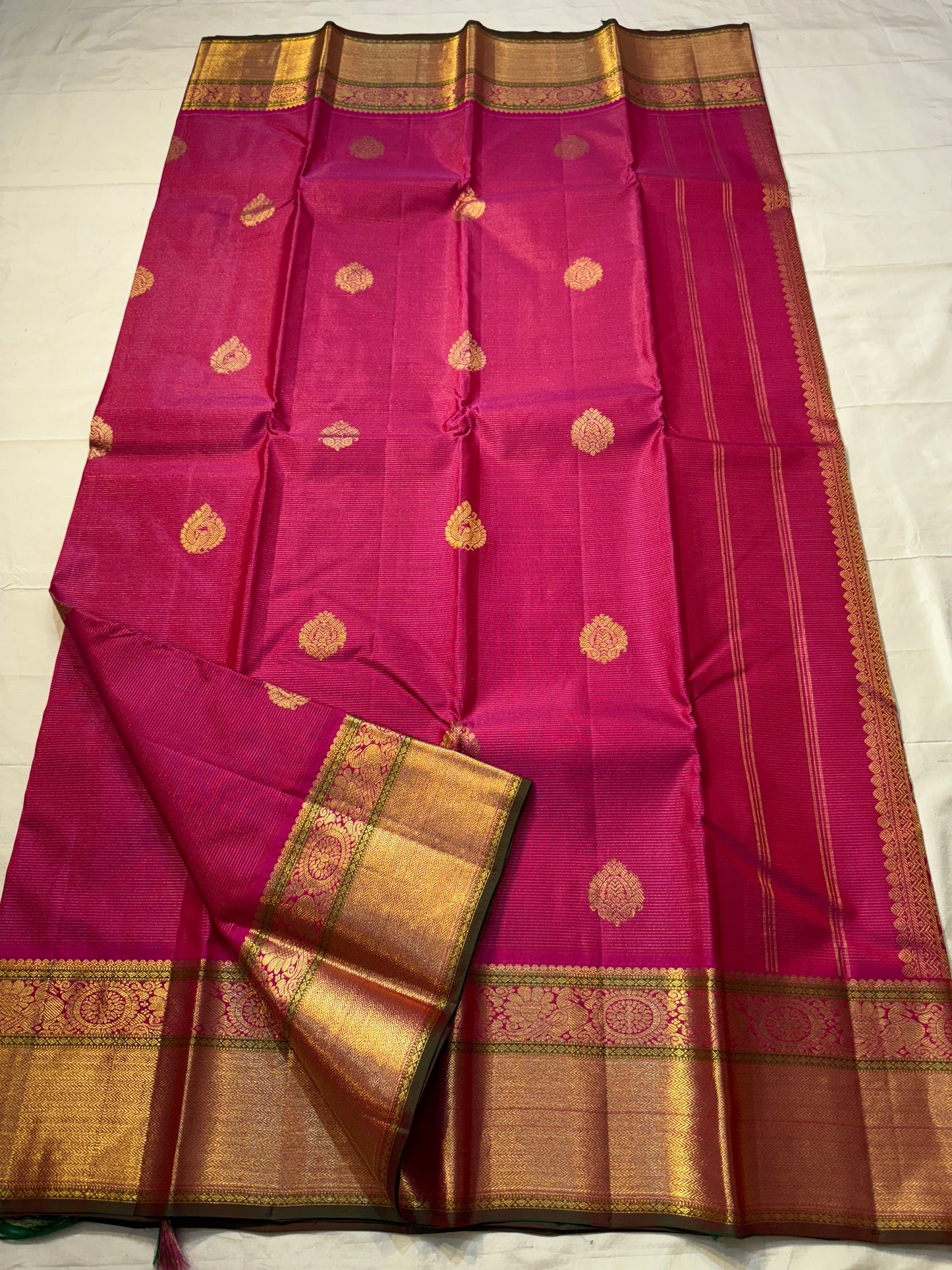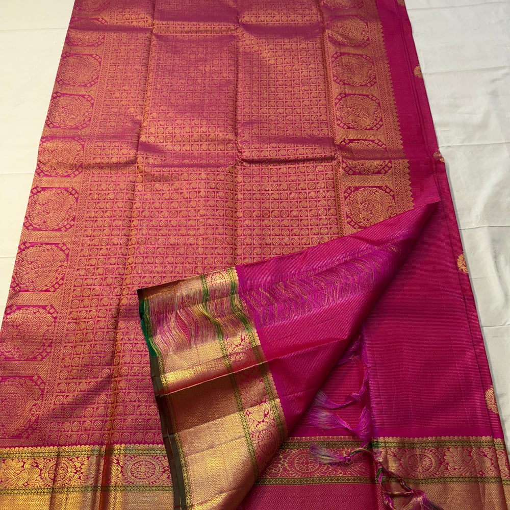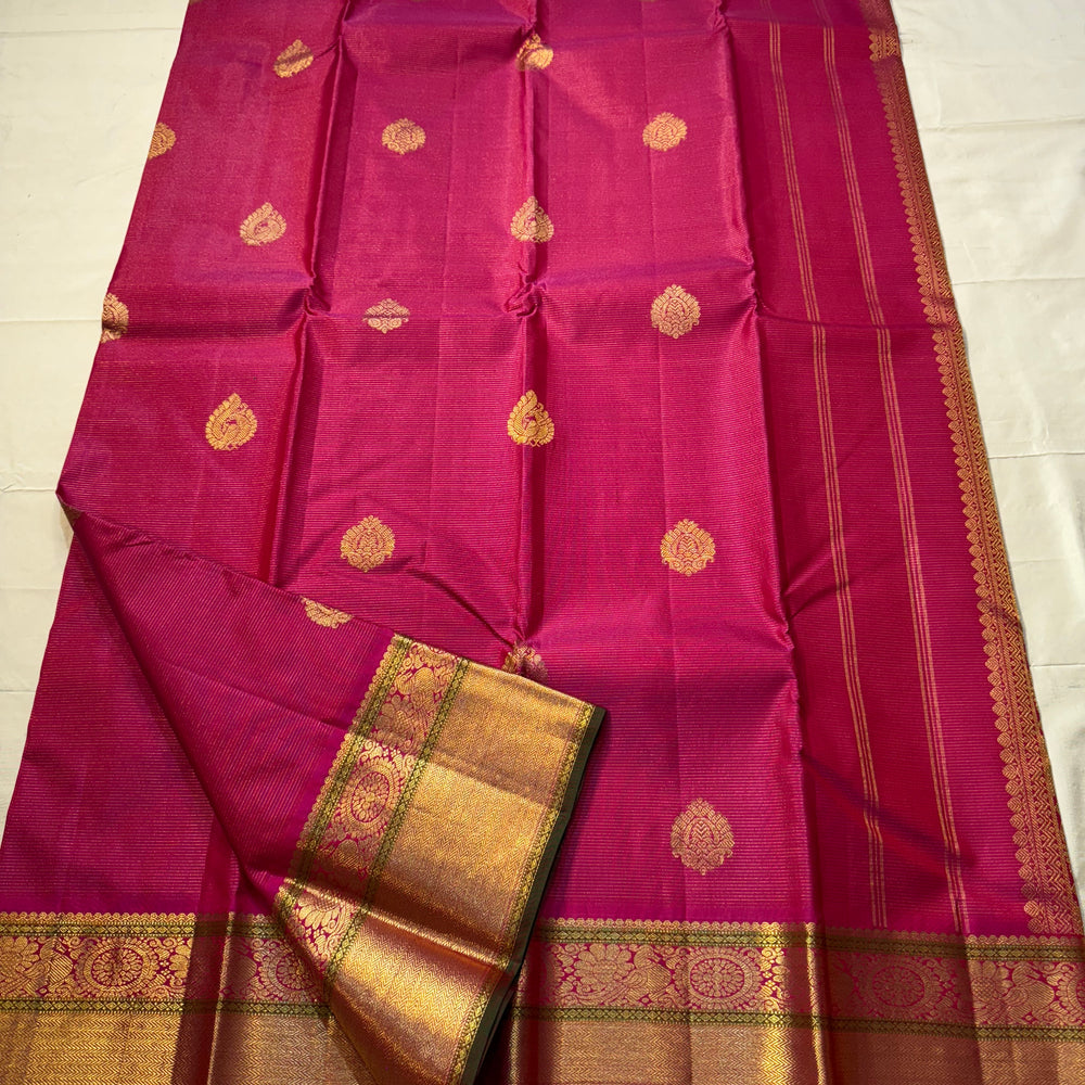 That’s the magic of Korvai — the art of interlocking contrast borders into the body of a Kanchi silk saree. No shortcuts. Just centuries of skill woven into every inch.