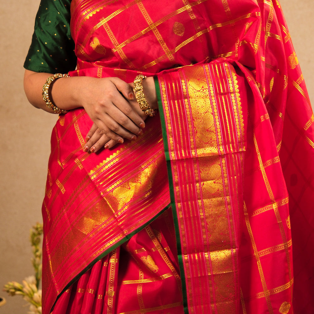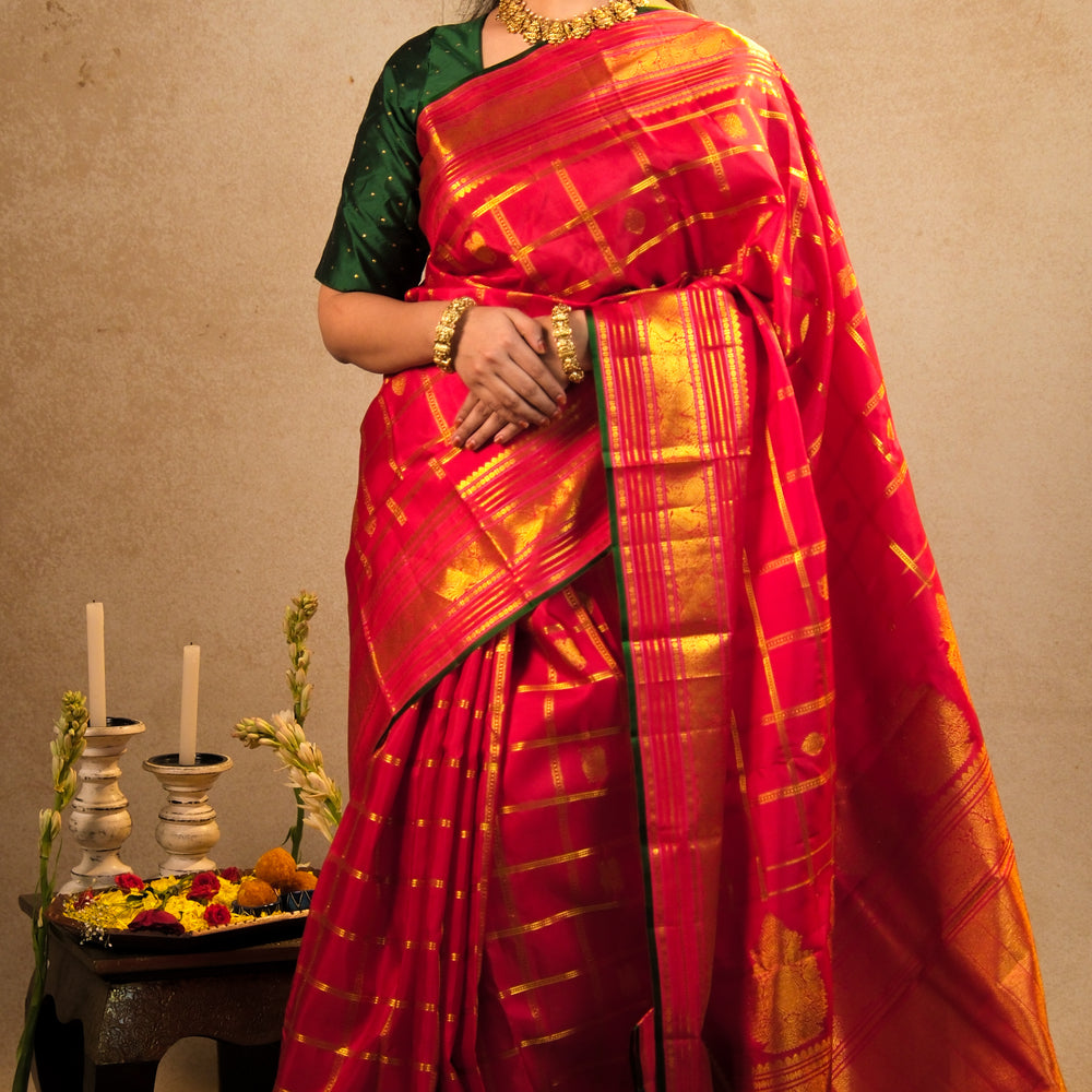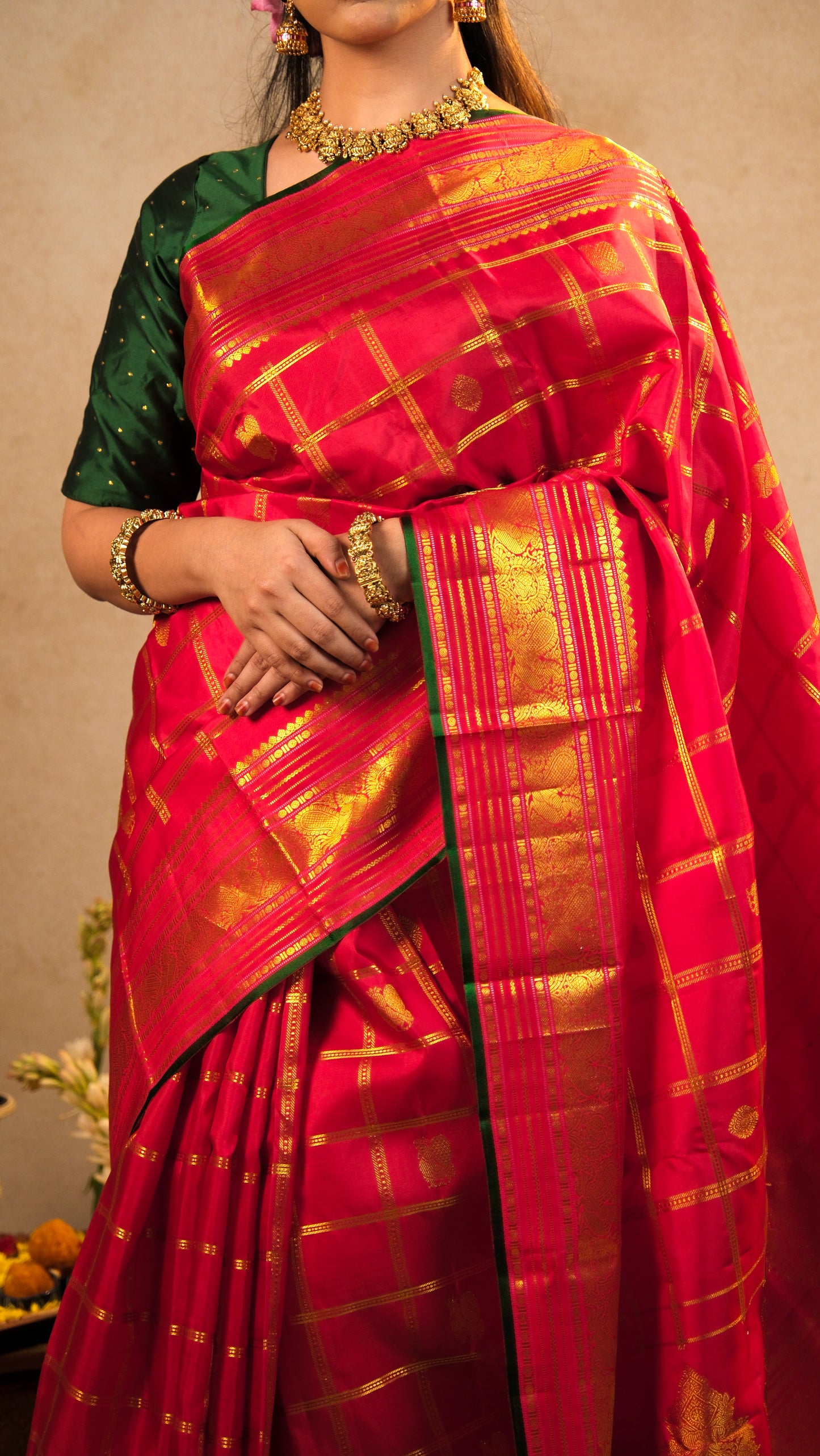 Draped in a rich chilly red hue, this saree radiates warmth and grandeur. The intricate kattam (checkered) weave brings a classic South Indian charm, while the pure silk texture adds a luxurious drape and sheen that is signature to Kanchipuram artistry.