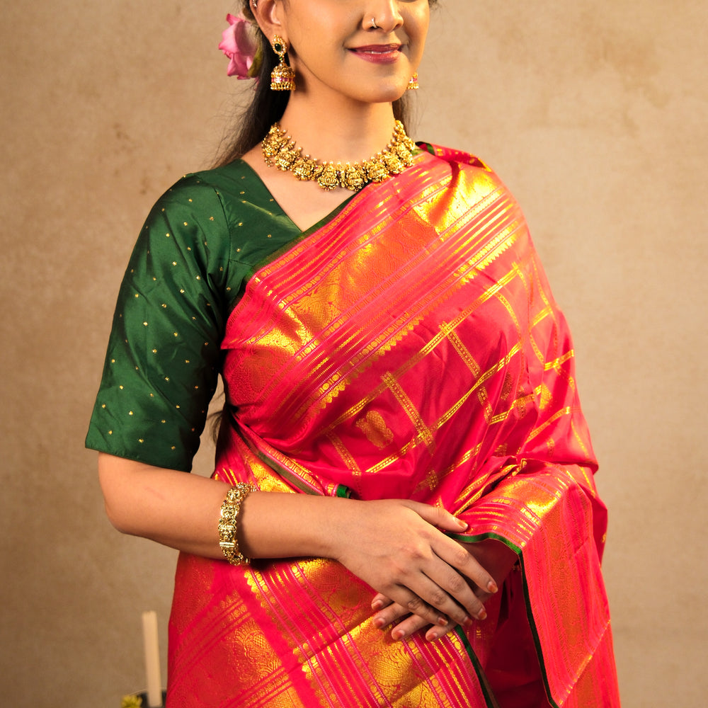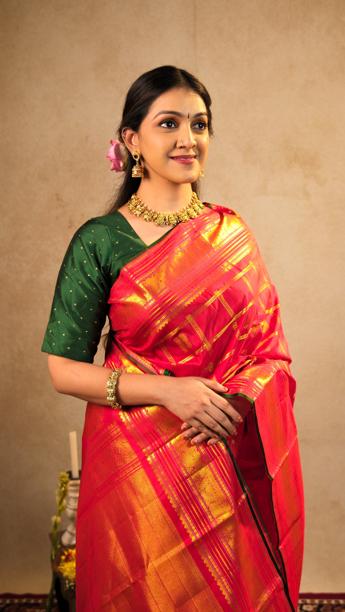 Saree Fabric: Step into timeless elegance with our Chilly Red Kattam Kanchipuram Vintage Silk Saree, a masterpiece that weaves together tradition, craftsmanship, and regal allure.