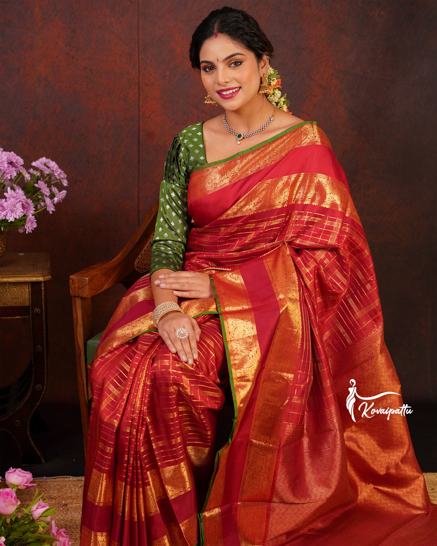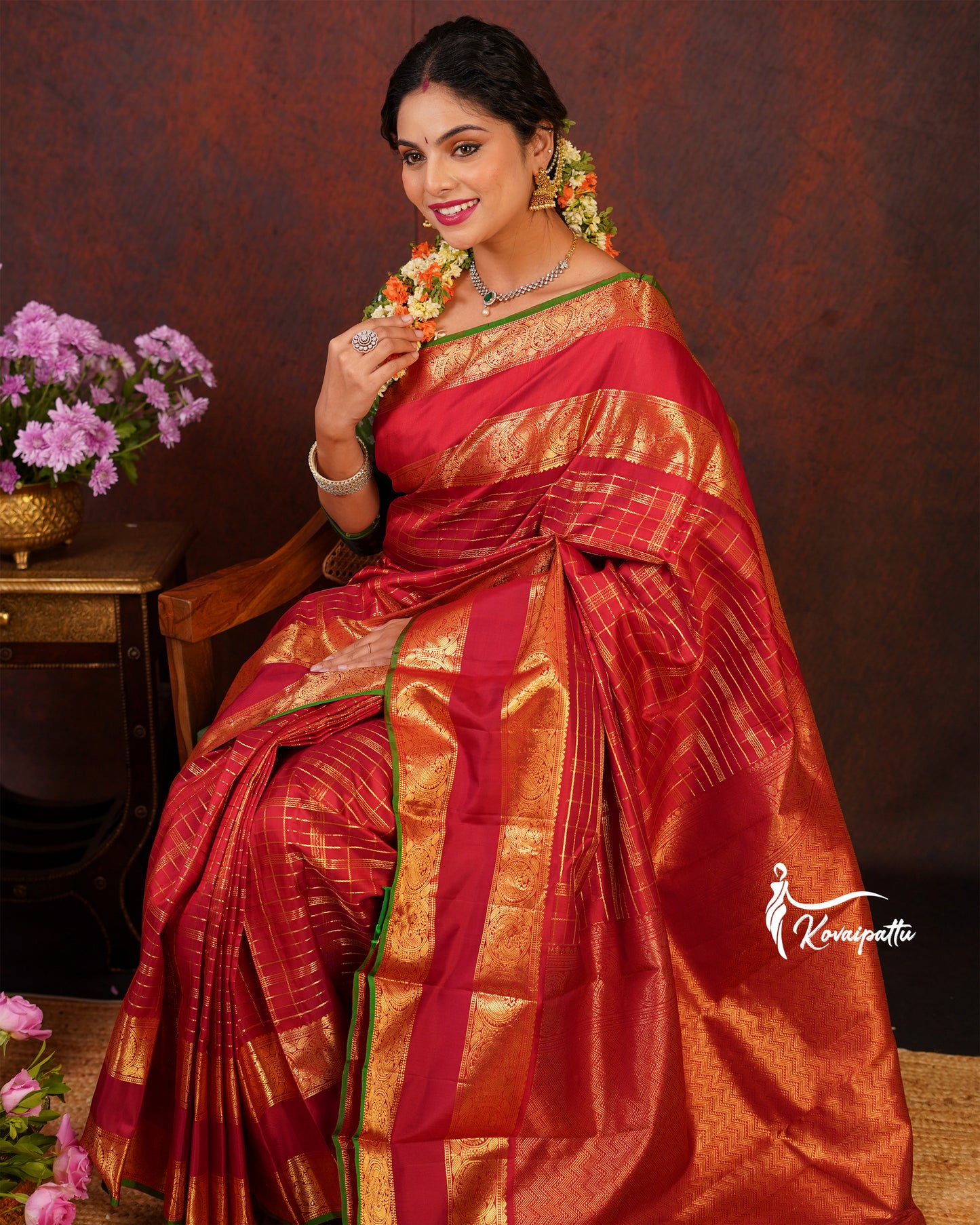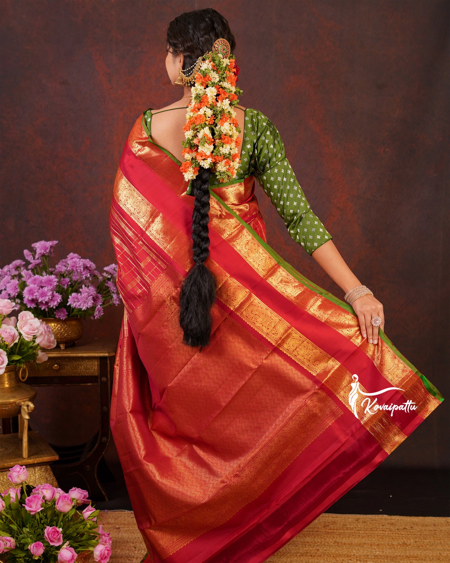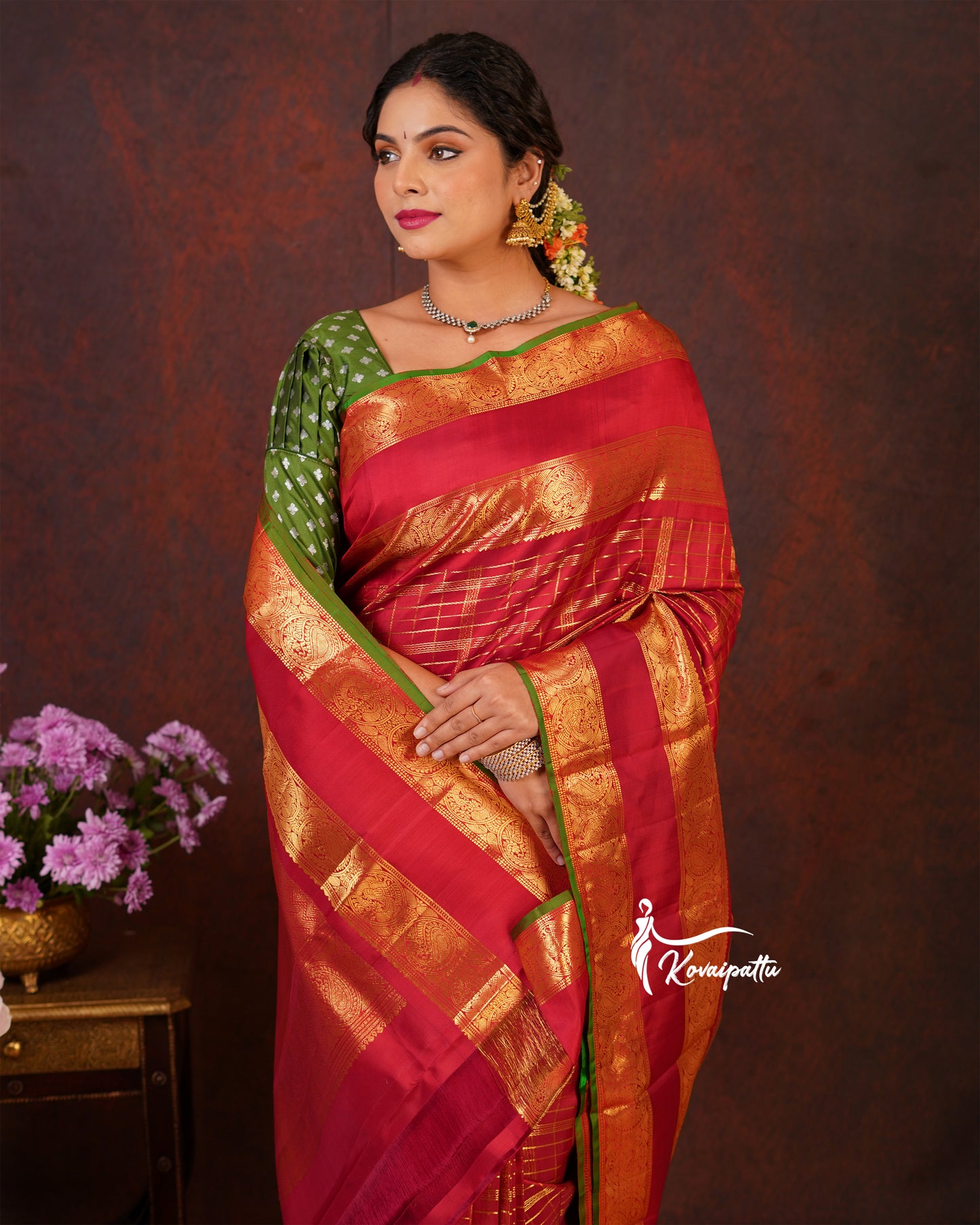 Saree Fabric: This elegant Marron Kattam Kanjivaram silk saree.