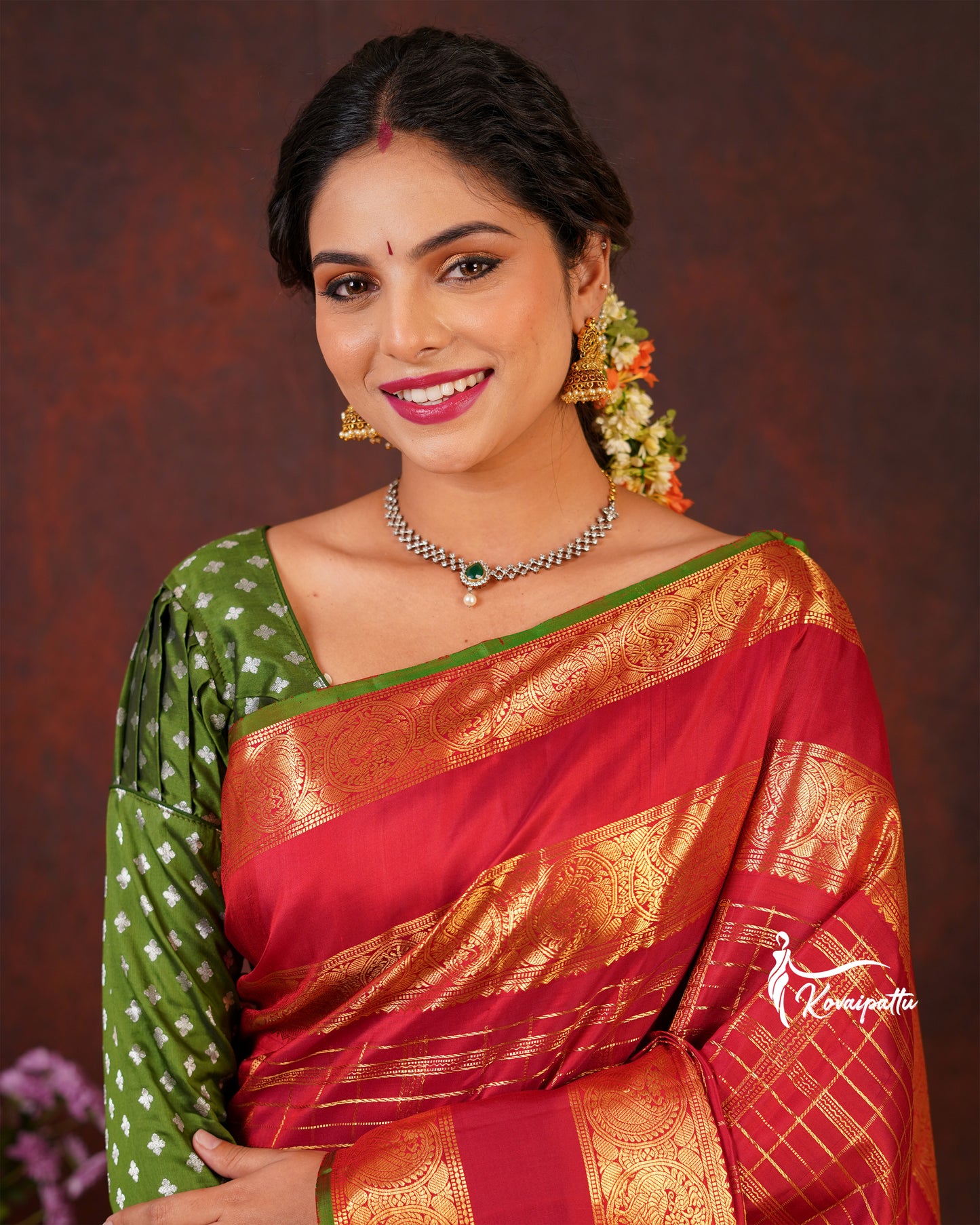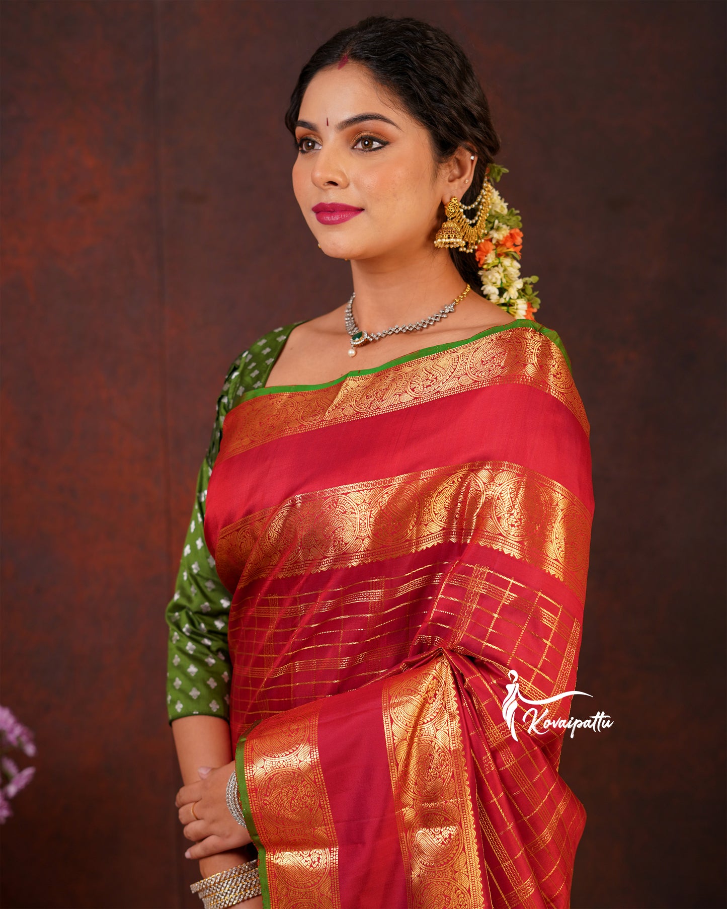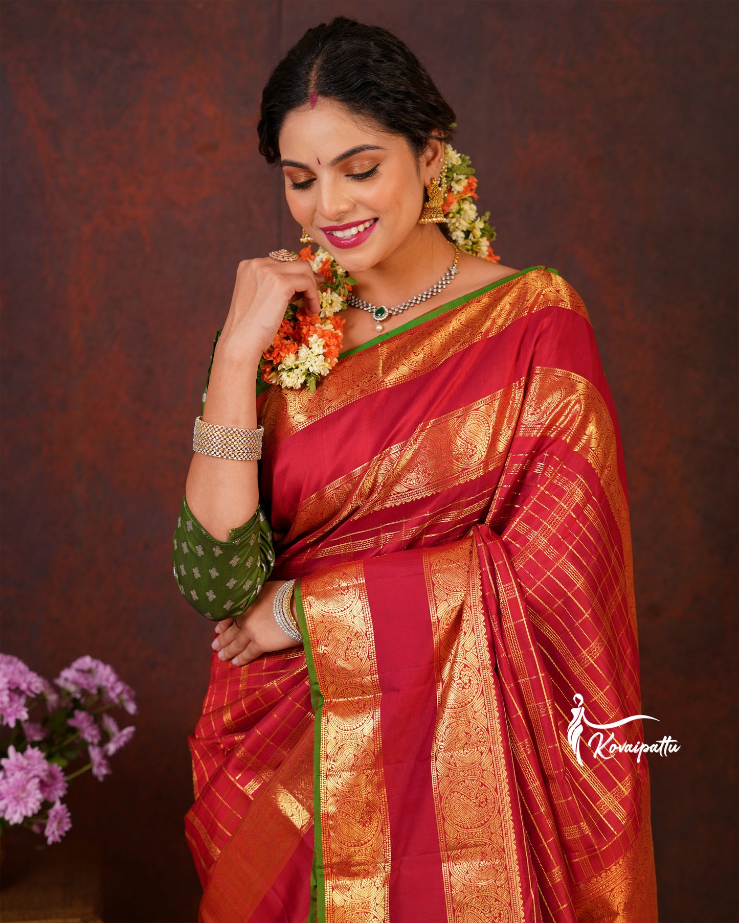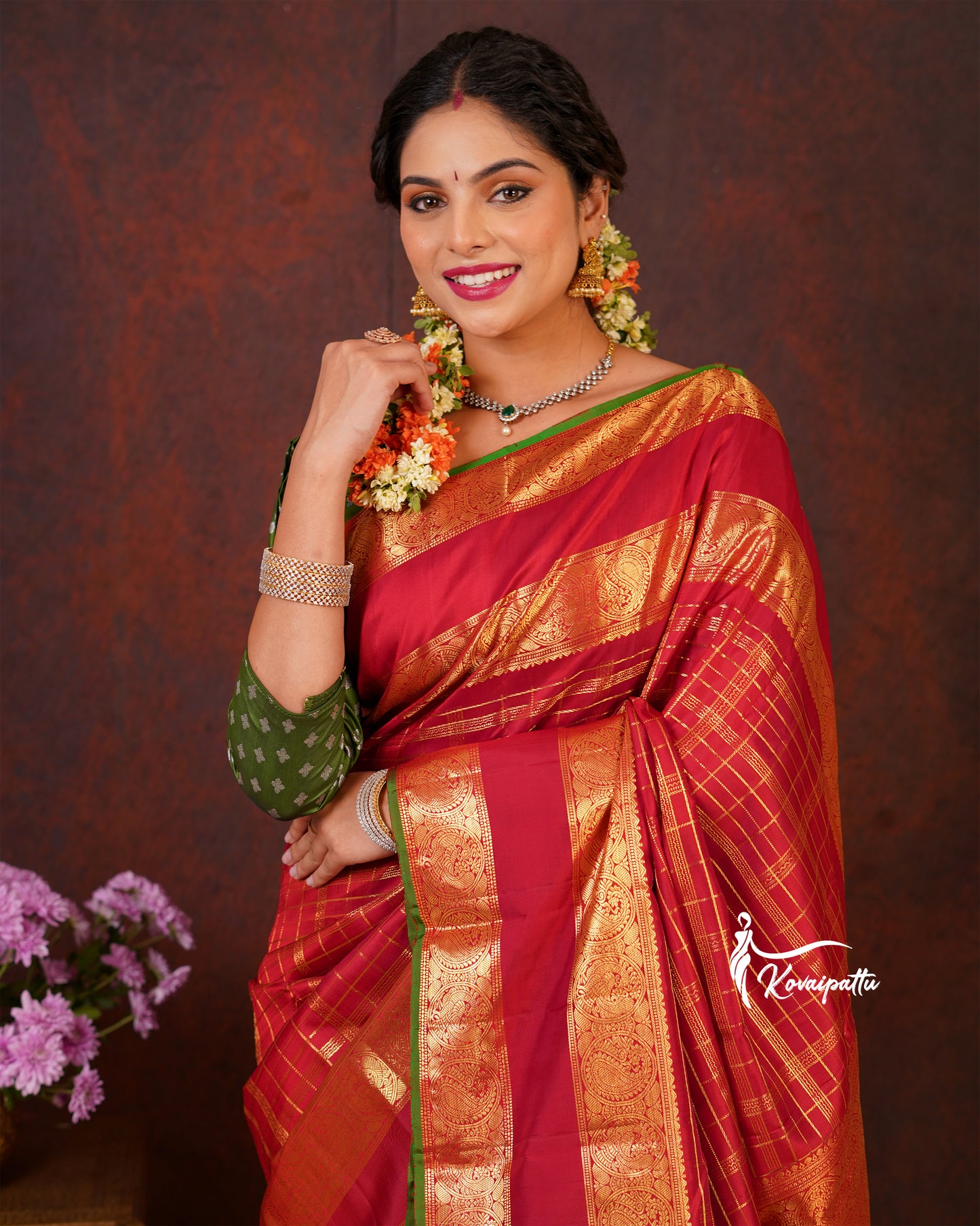 Saree Fabric: This elegant Marron Kattam Kanjivaram silk saree.