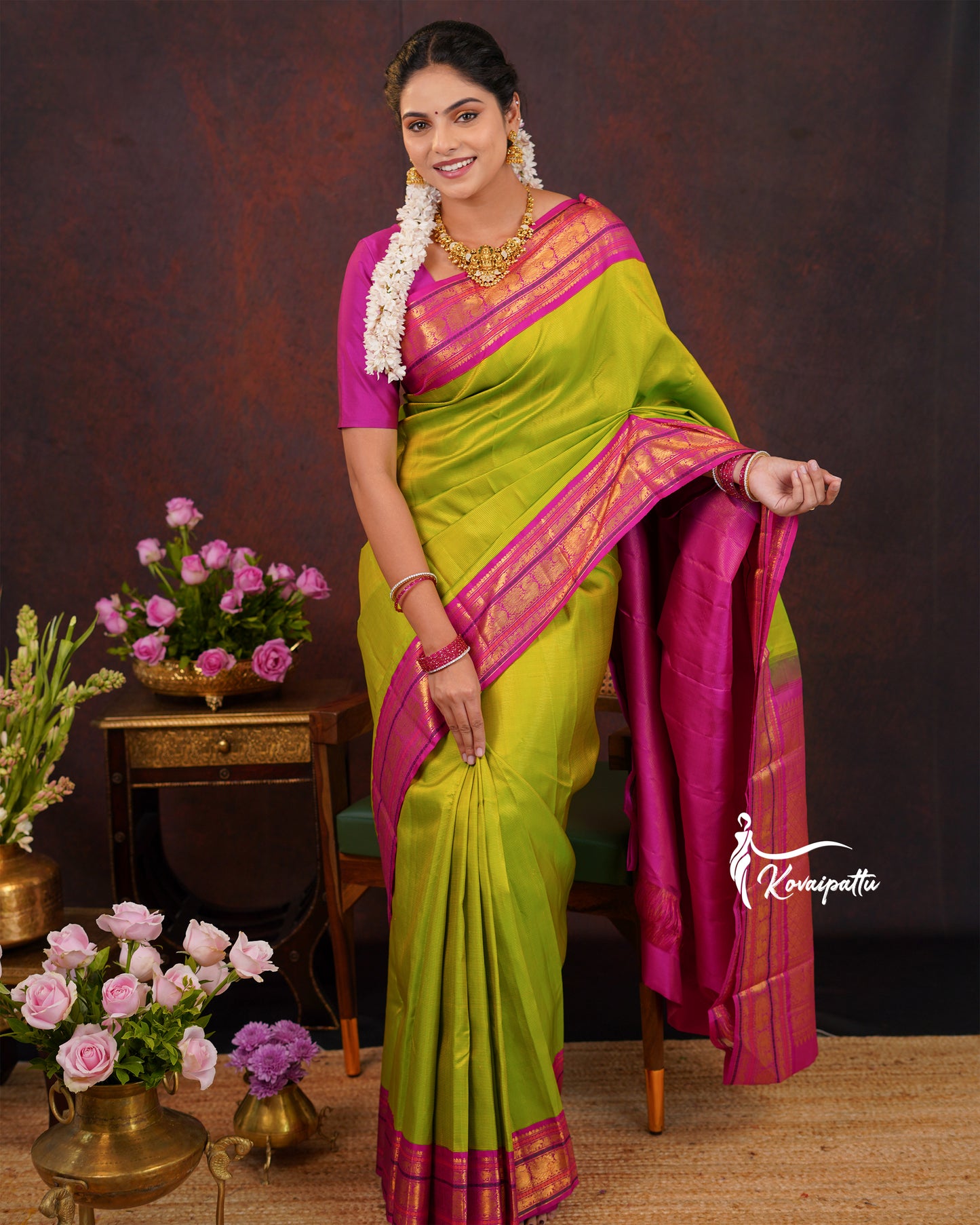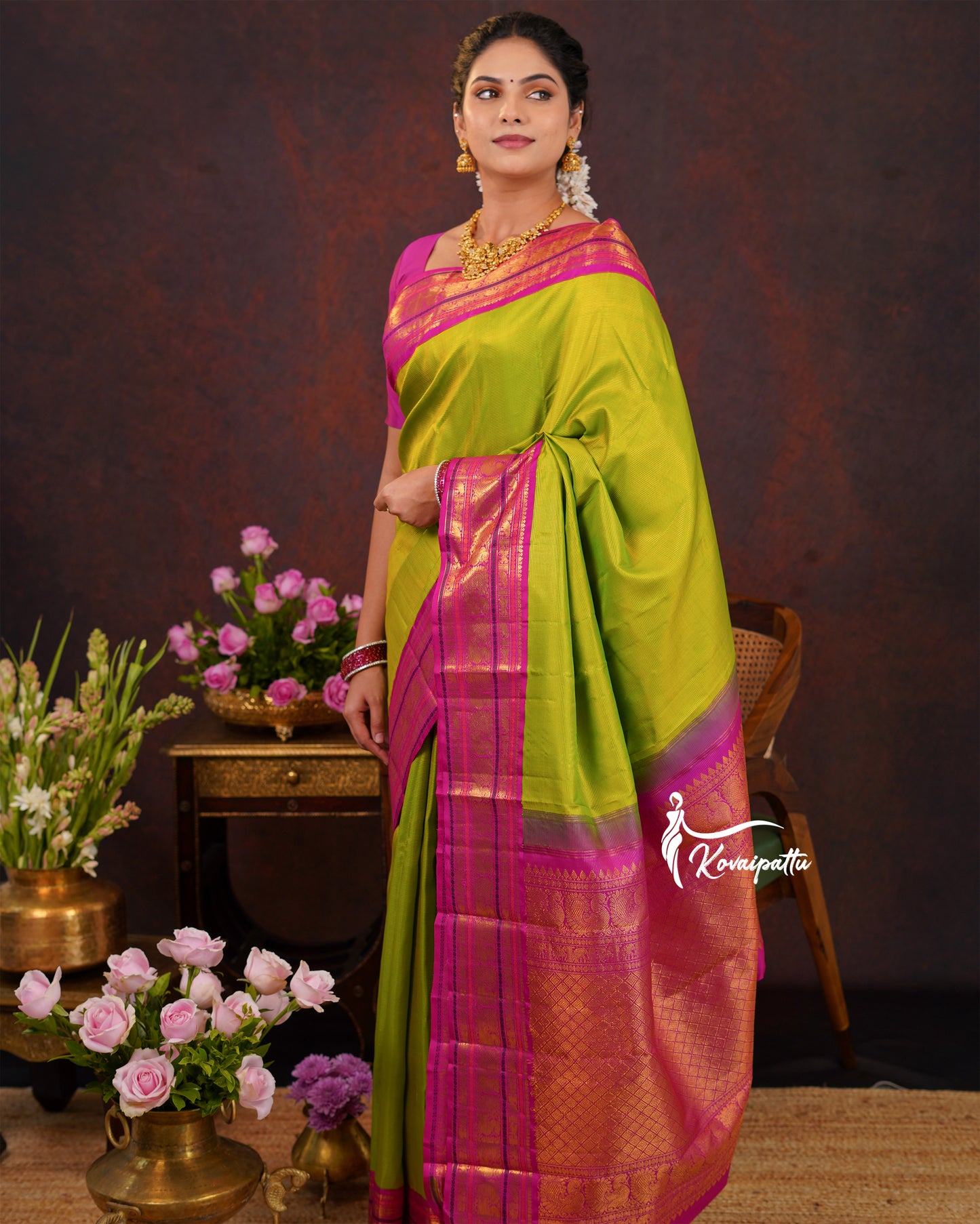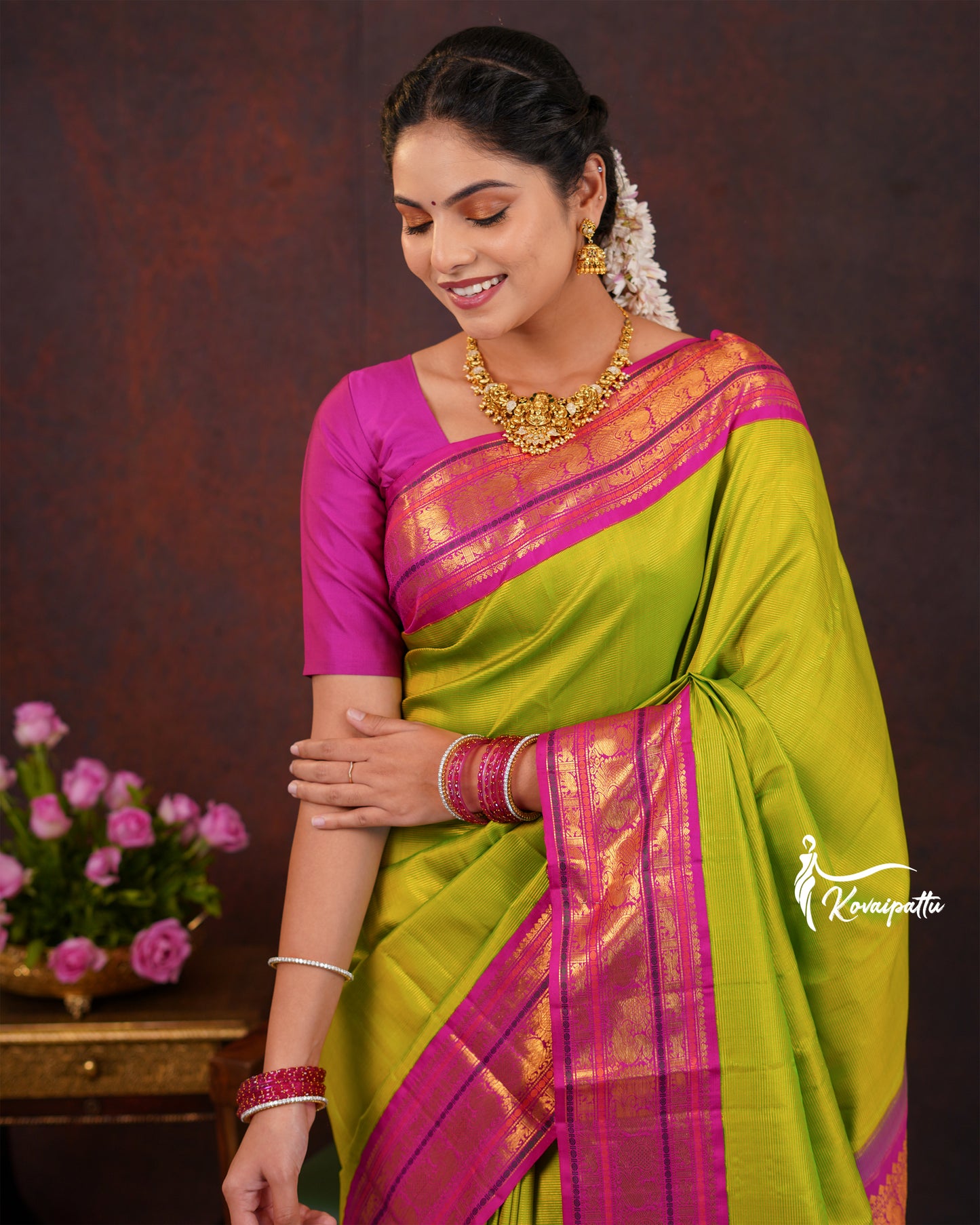 Saree Fabric: This elegant Parrot Green Kanjivaram Vaira Oosi Silk Saree features a rich pink contrast zari border and traditional woven detailing.