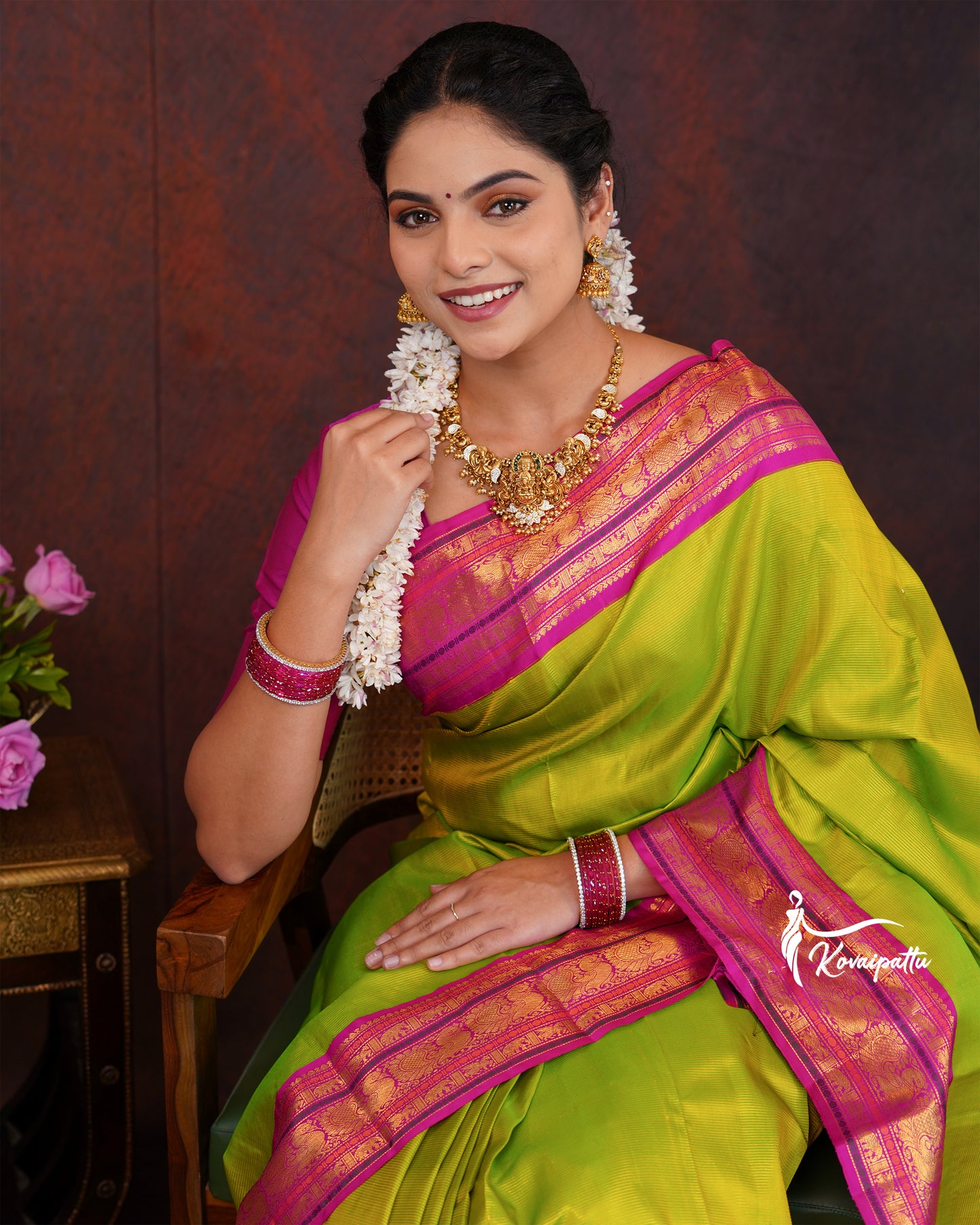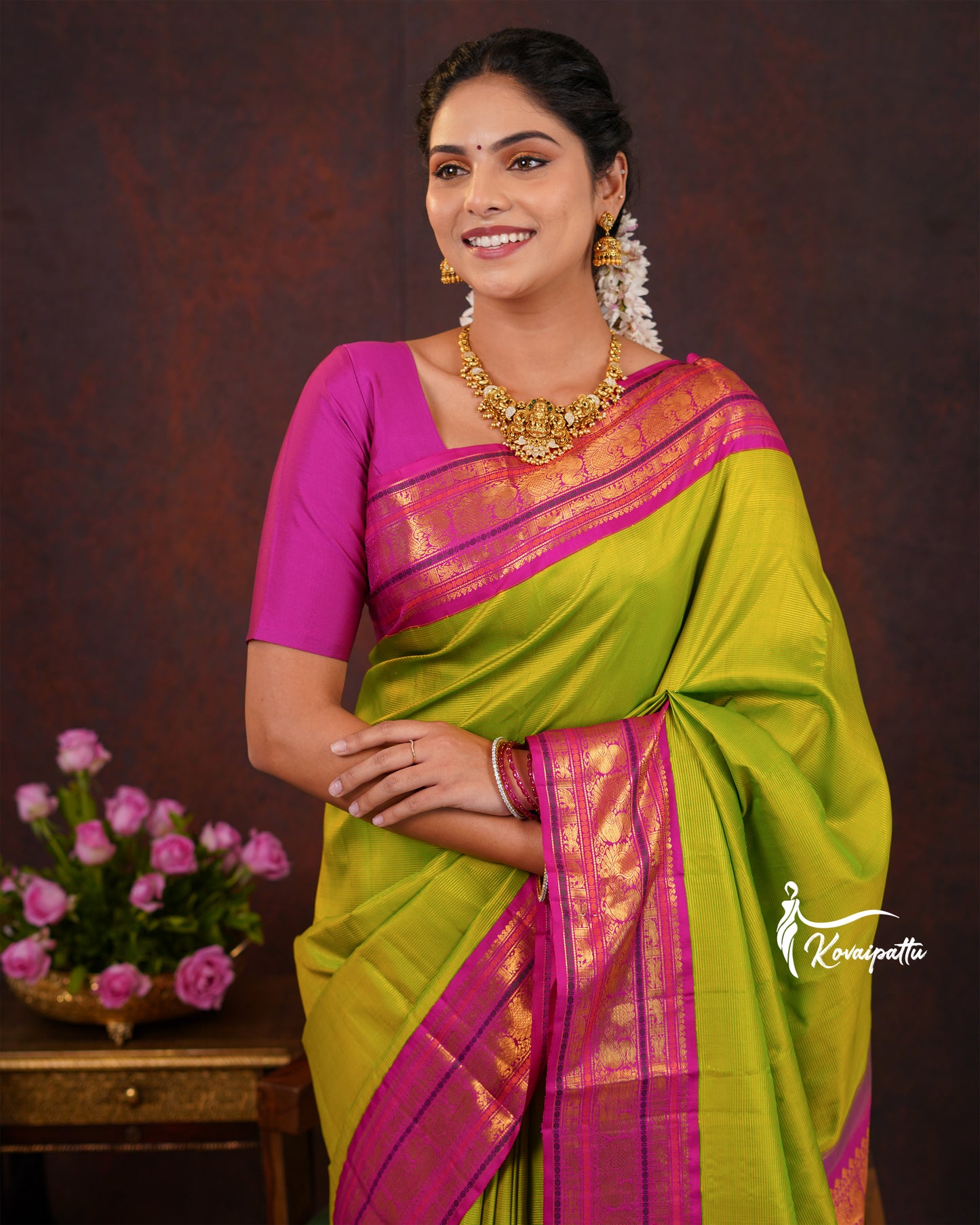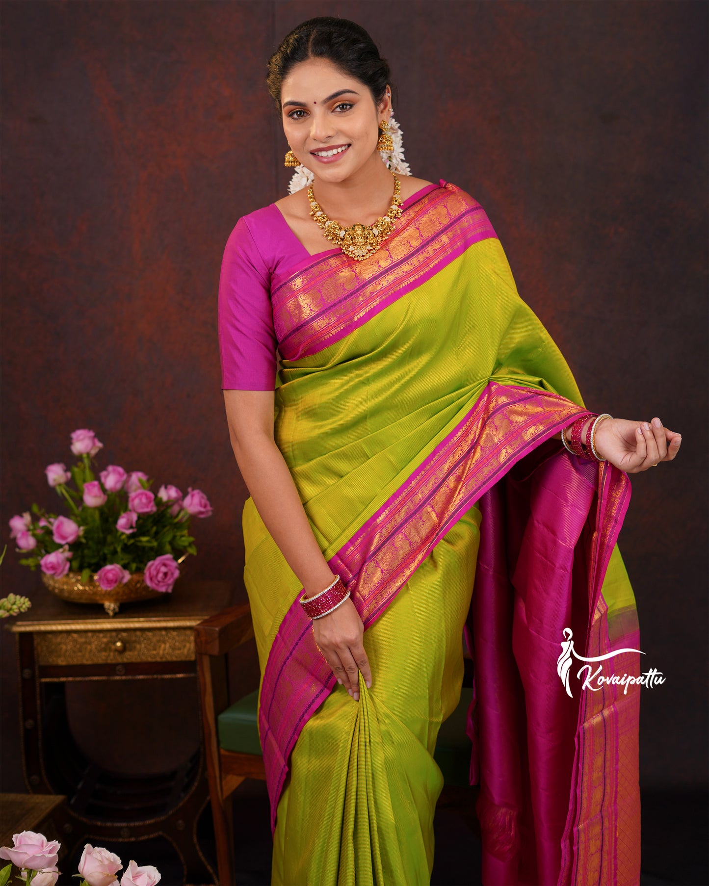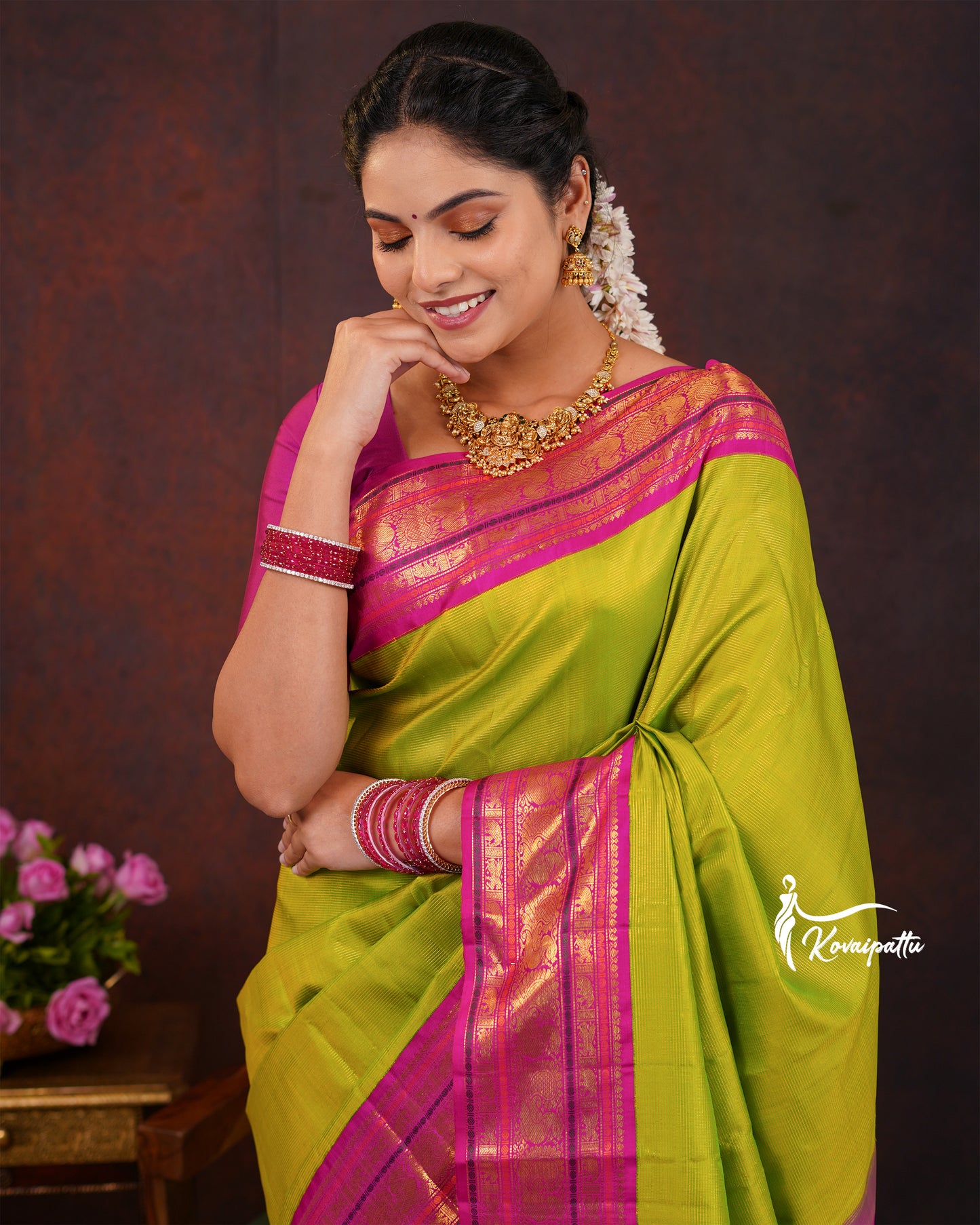 Saree Fabric: This elegant Parrot Green Kanjivaram Vaira Oosi Silk Saree features a rich pink contrast zari border and traditional woven detailing.