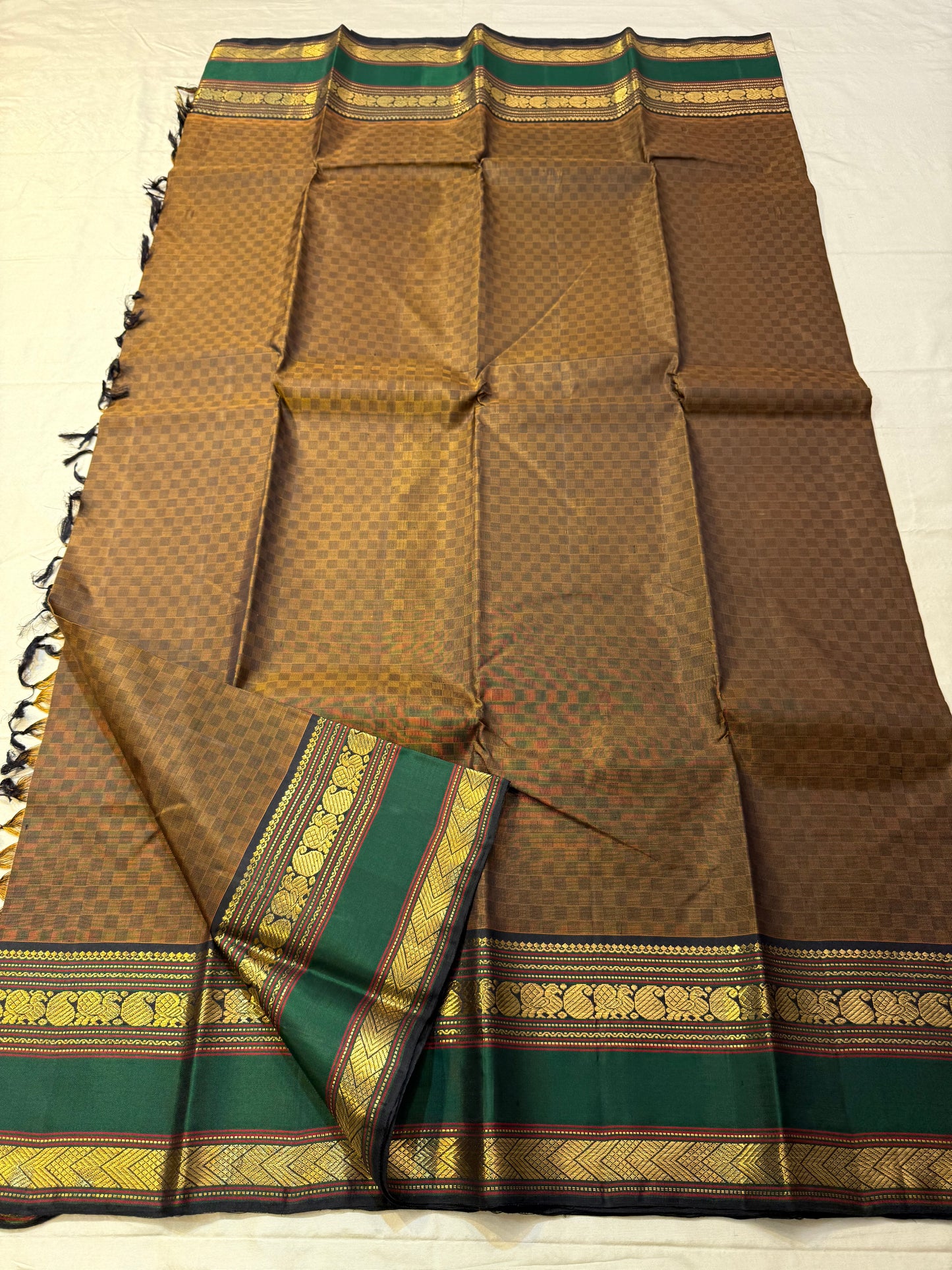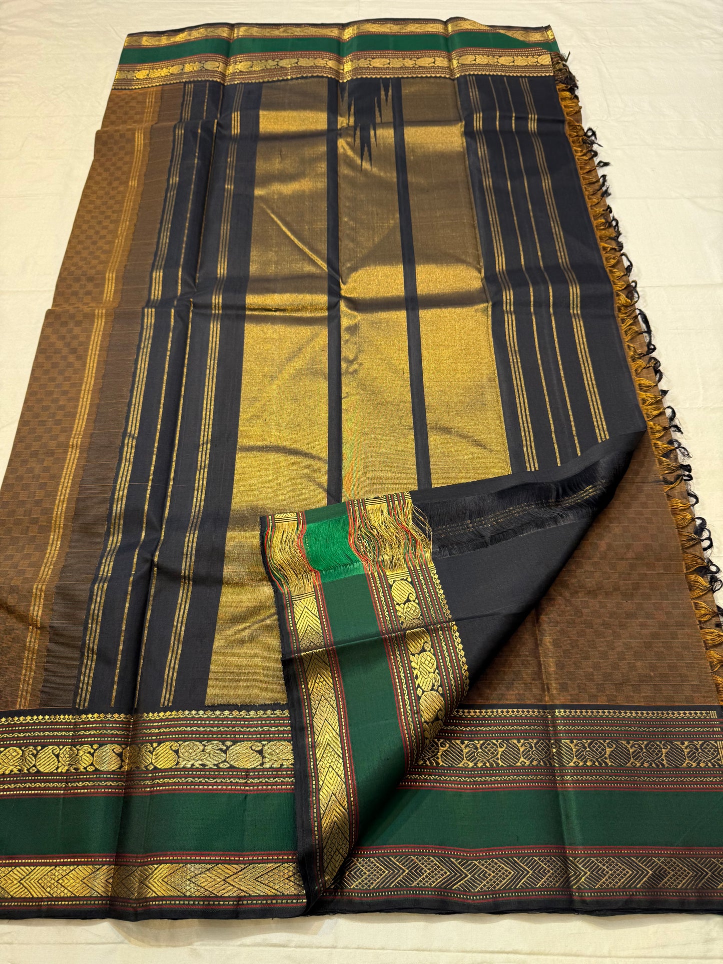 Regular price Rs. 13,500.00Saree Fabric: Drape yourself in timeless elegance with this exquisite vintage Kanchipuram silk saree, a true testament to the artistry of South Indian handloom weaving.The saree boasts a richly woven zari border and pallu.