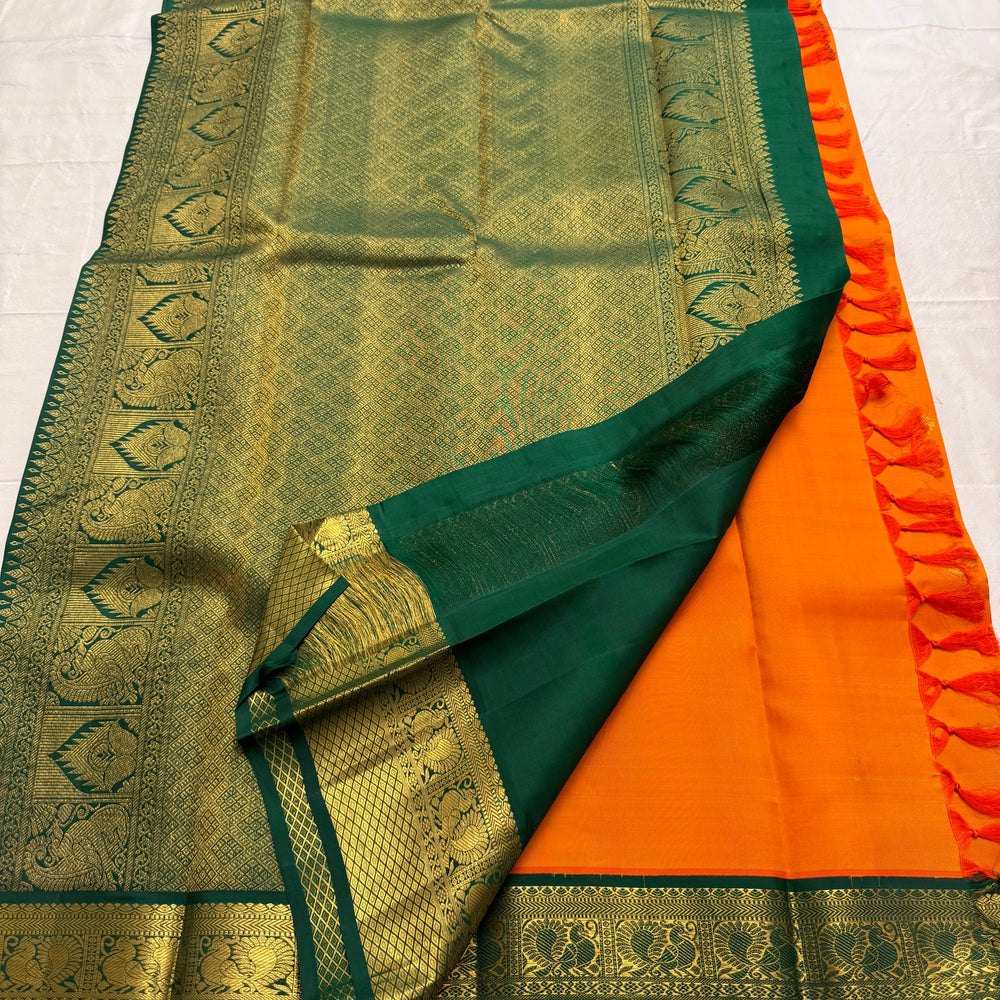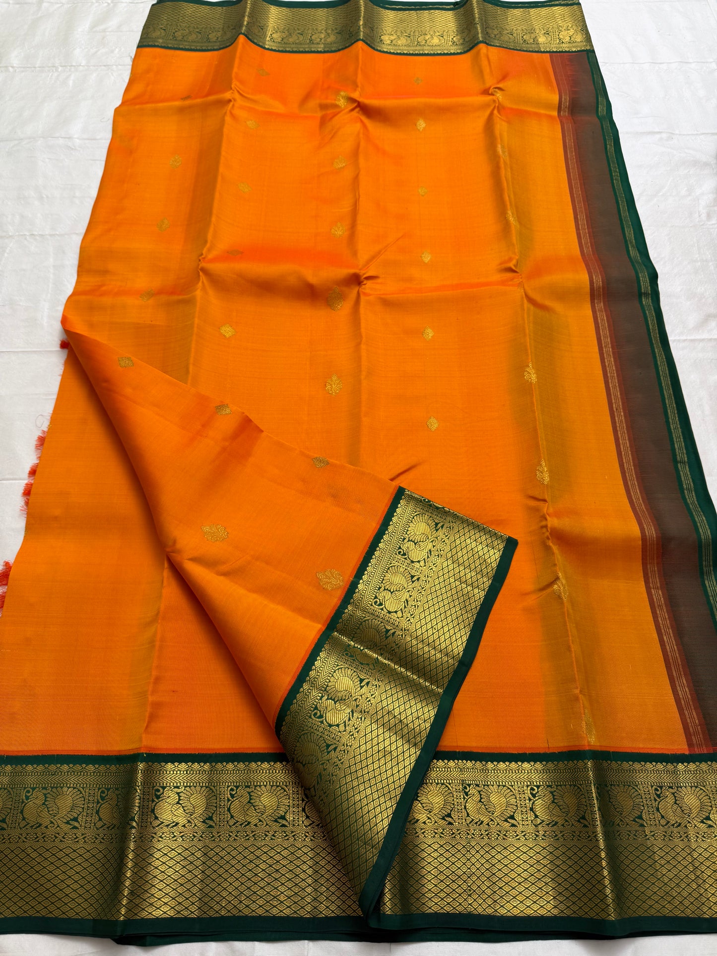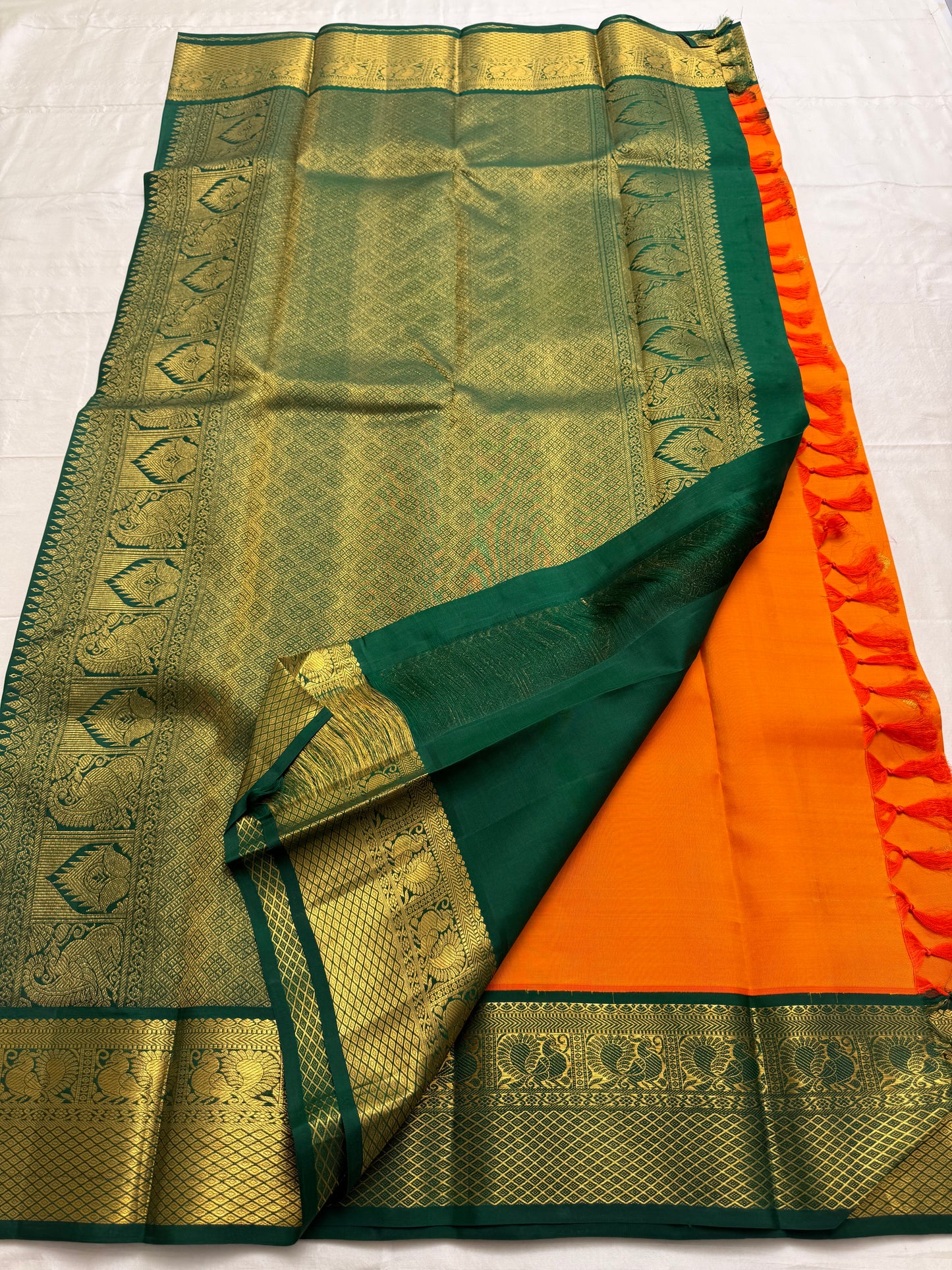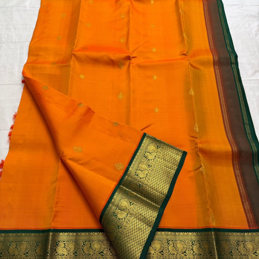 Regular price Rs. 15,500.00Saree Fabric: Drape yourself in timeless elegance with this exquisite vintage Kanchipuram silk saree, a true testament to the artistry of South Indian handloom weaving.The saree boasts a richly woven zari border and pallu.