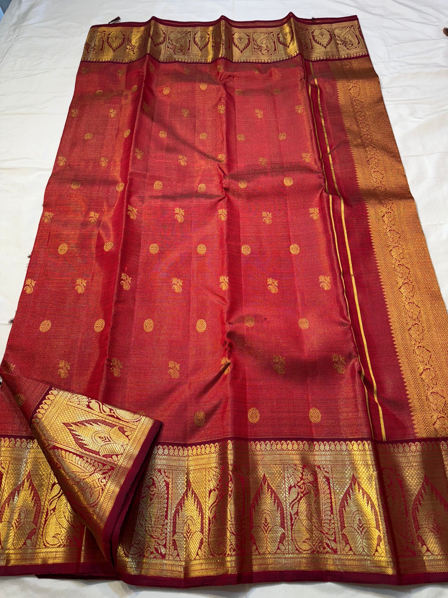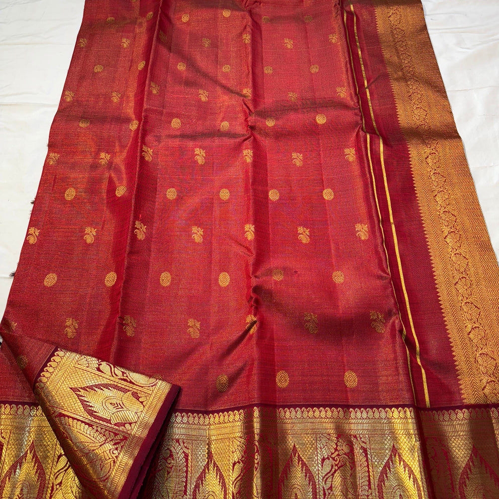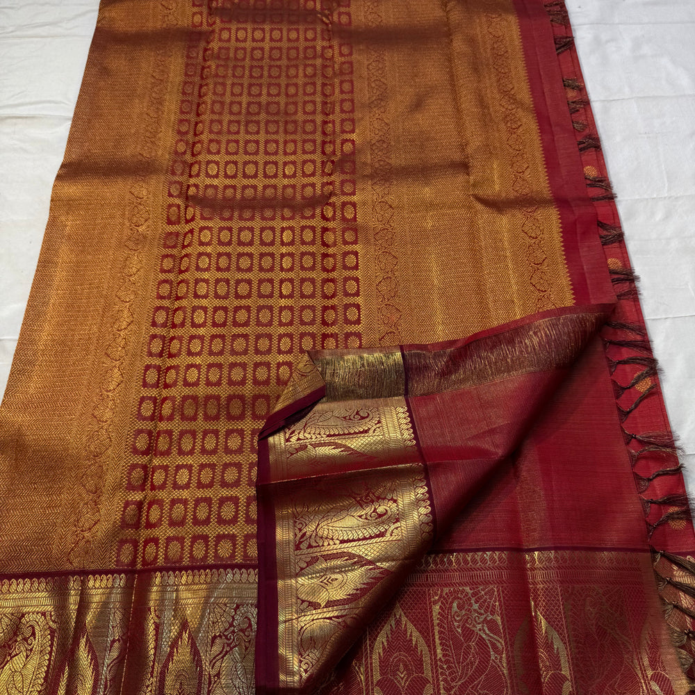 Regular price Rs. 17,000.00Saree Fabric: Drape yourself in timeless elegance with this exquisite vintage Kanchipuram silk saree, a true testament to the artistry of South Indian handloom weaving.The saree boasts a richly woven zari border and pallu.