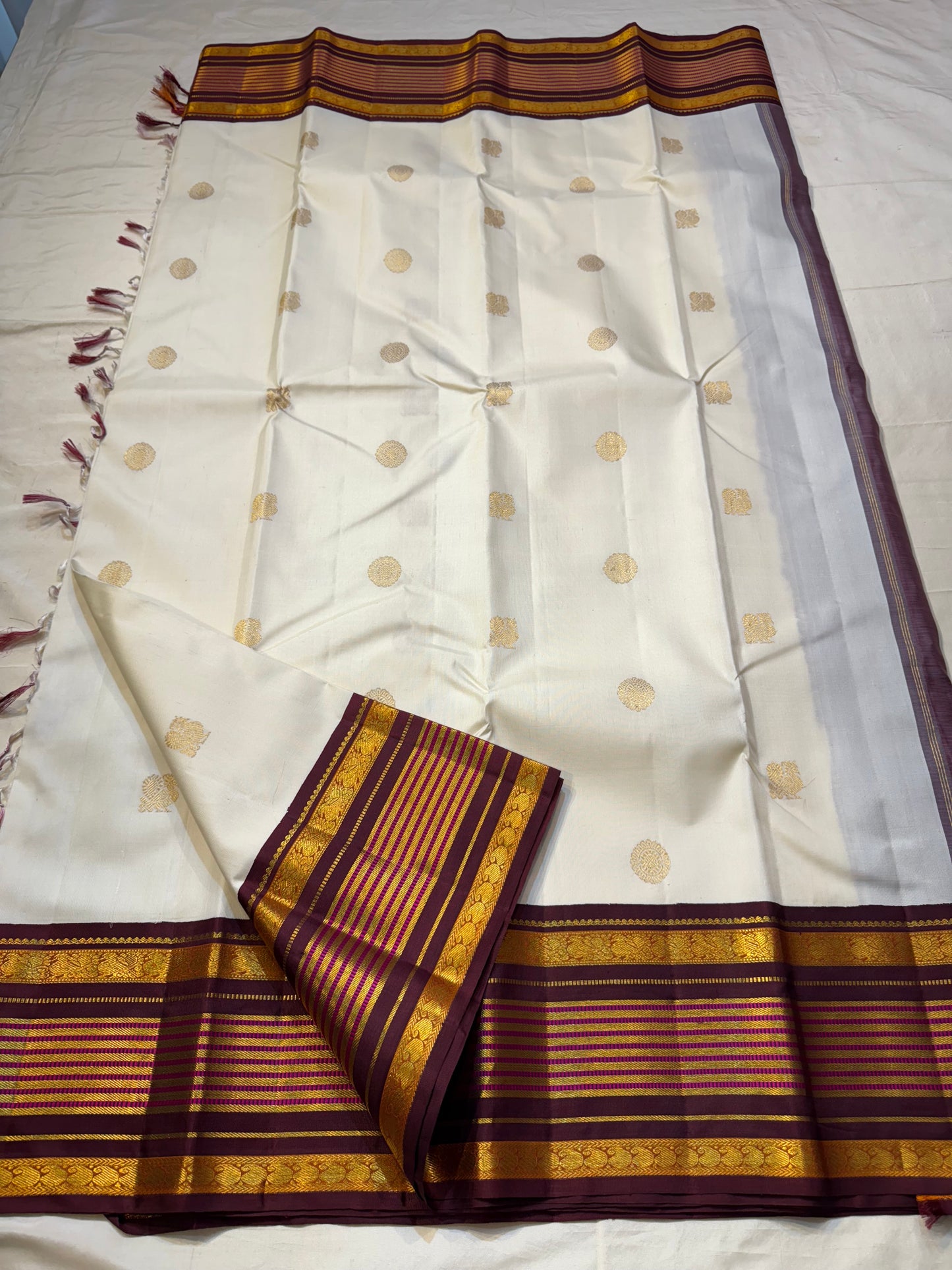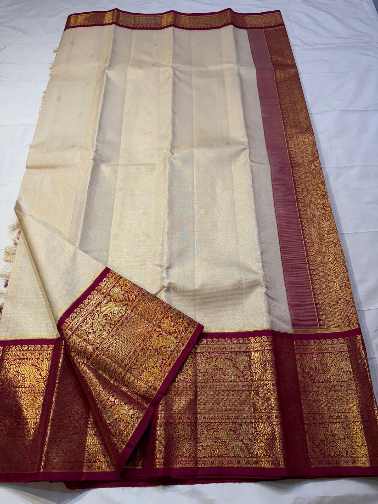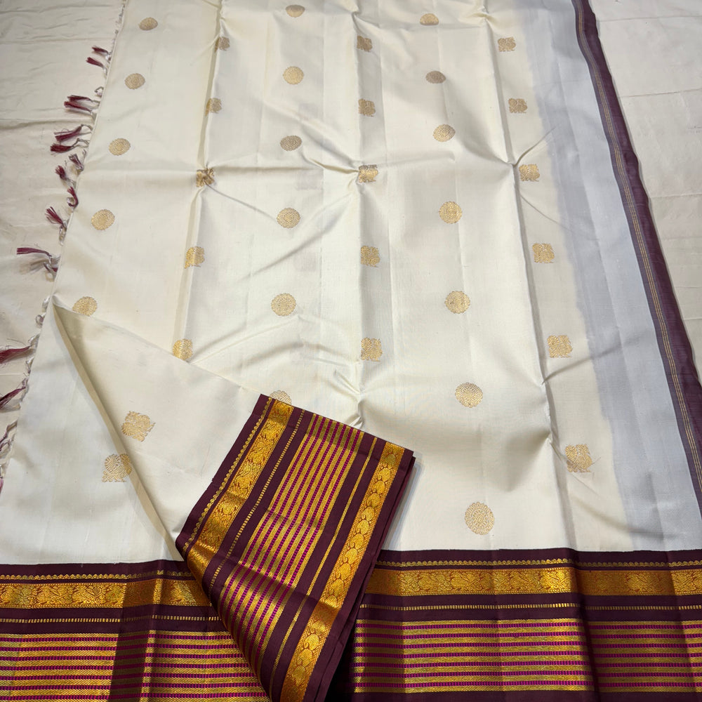 Regular price Rs. 18,500.00Saree Fabric: Drape yourself in timeless elegance with this exquisite vintage Kanchipuram silk saree, a true testament to the artistry of South Indian handloom weaving.The saree boasts a richly woven zari border and pallu.